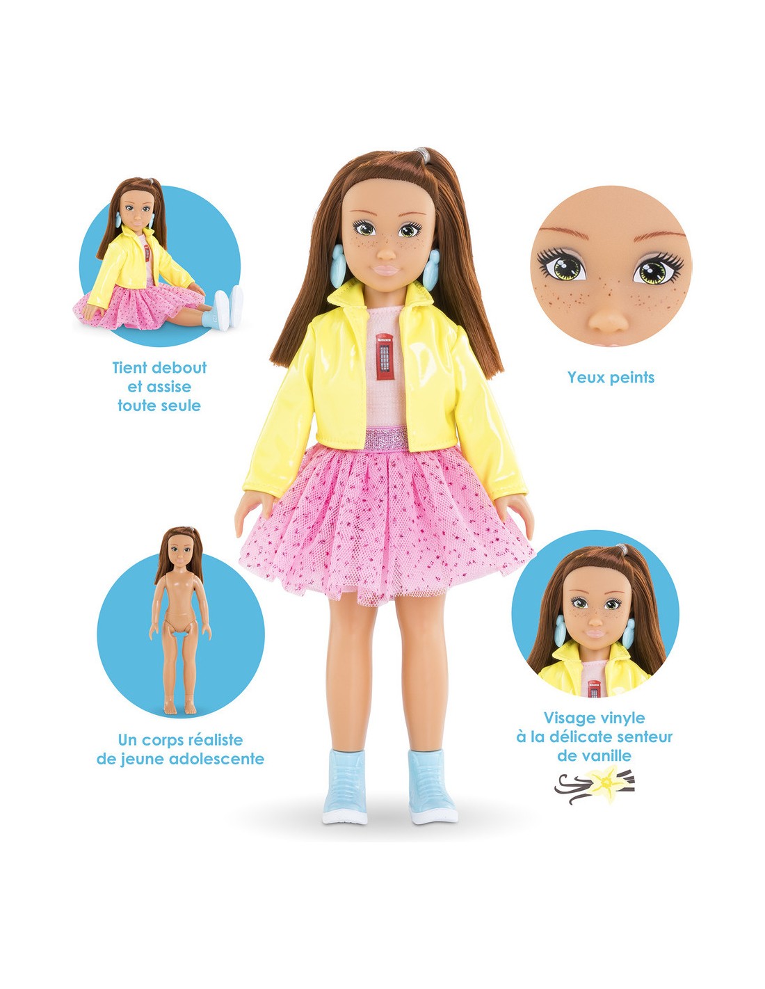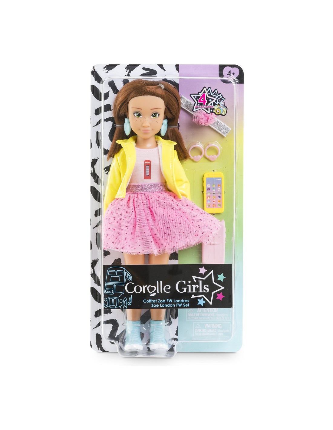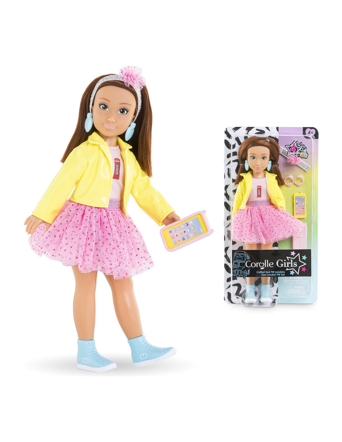 Le coffret Zoé Fashion Week Londres est composé de Zoé, une poupée mannequin de 28 cm, et de 4 accessoires : 1 paire de boucles d'oreilles amovibles, 1 téléphone mobile, 1 coque pour téléphone portable et 1 bandeau pour les cheveux. Zoé a un joli visage naturel aux traits fins qui sent bon la vanille.