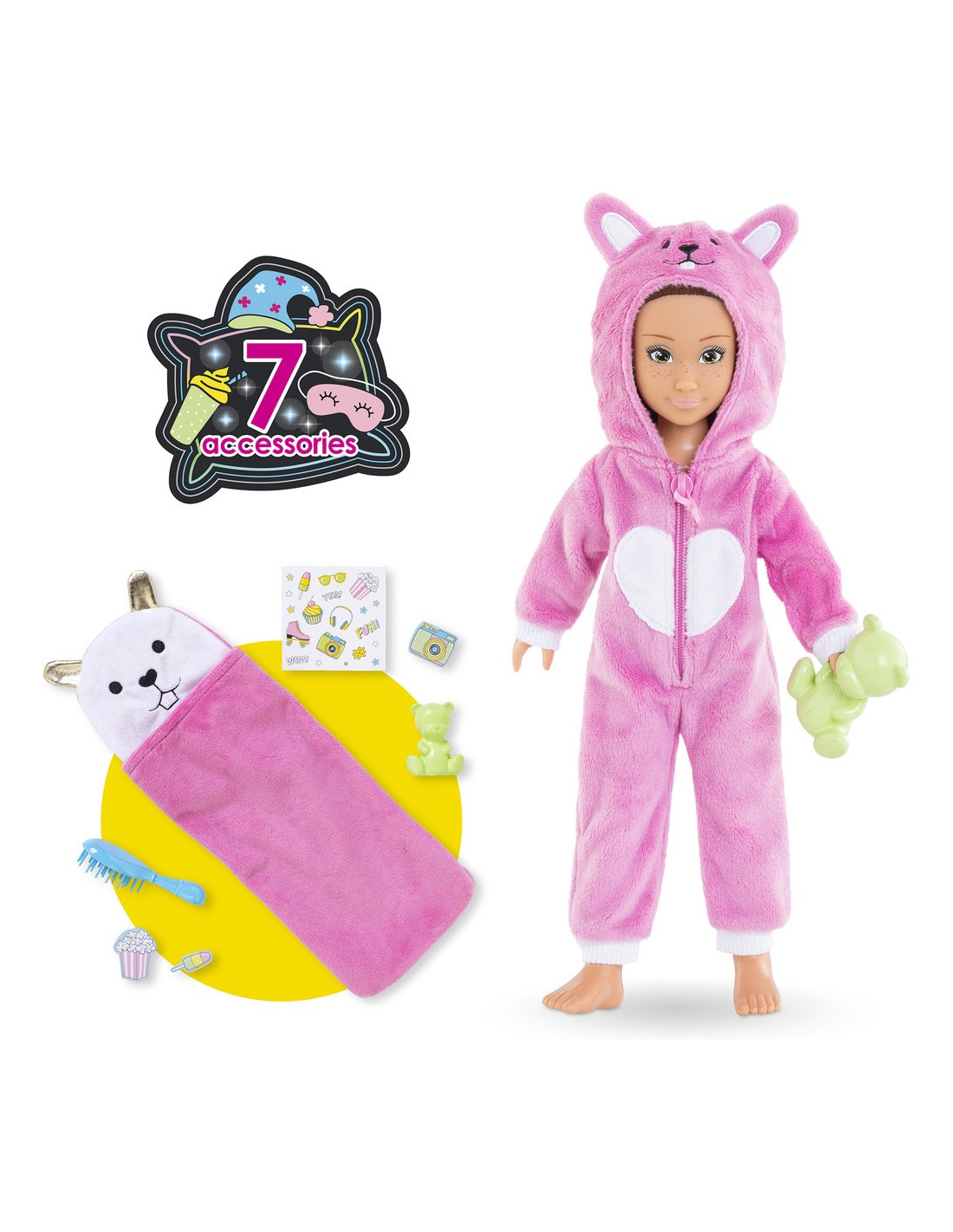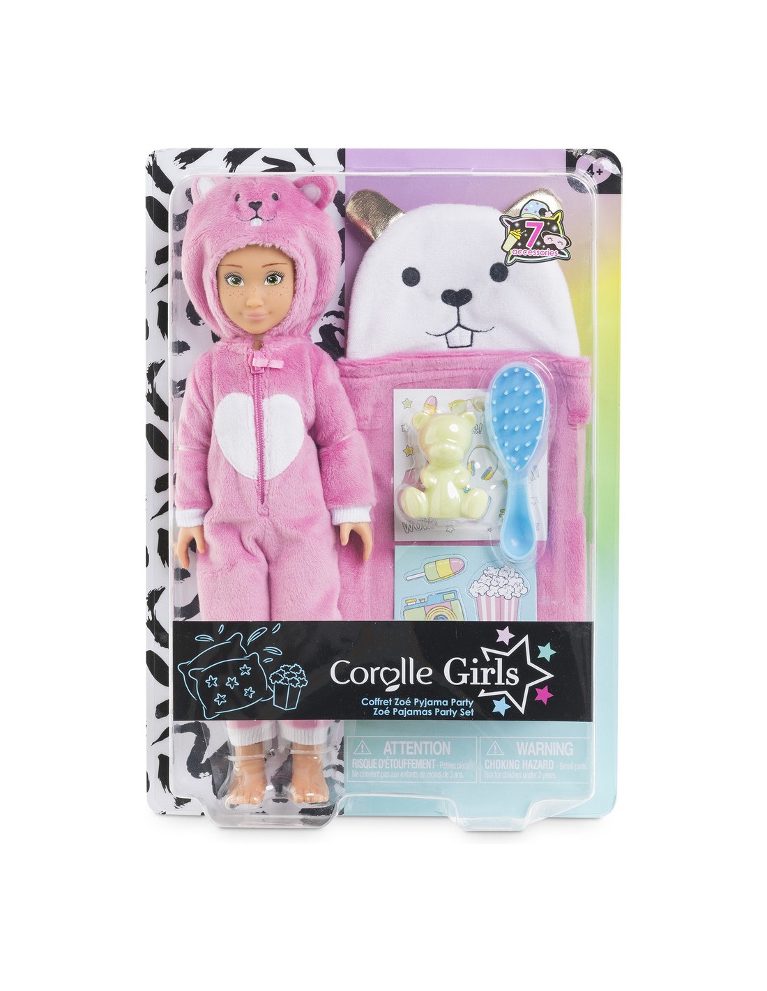 Le coffret Zoé Pyjama Party est composé de Zoé, une poupée mannequin de 28 cm, et de 7 accessoires : 1 sac de couchage, 1 brosse à cheveux, 1 ourson, 1 planche de stickers et 3 accessoires de jeu en carton ( 1 appareil photo, 1 glace, 1 paquet de pop-corn). Zoé a un joli visage naturel aux traits fins qui sent bon la vanille.