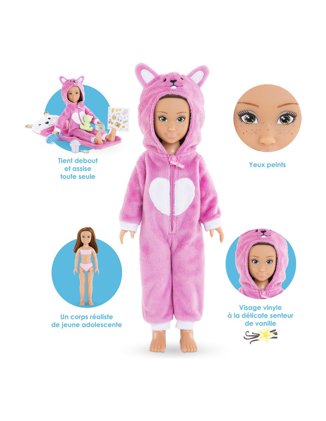 Ses yeux sont peints et elle possède des cheveux roux mi-longs. Elle porte une combi-pyjama lapin rose toute douce. Poupée mannequin à la peau blanche, Zoé a un corps réaliste de jeune adolescente. Elle tient assise et debout toute seule. Les Corolle Girls sont déclinées en plusieurs modèles et disposent de coffrets dressing pour encore plus de jeux ! Dès 4 ans. Corolle Girls; mes meilleures amies