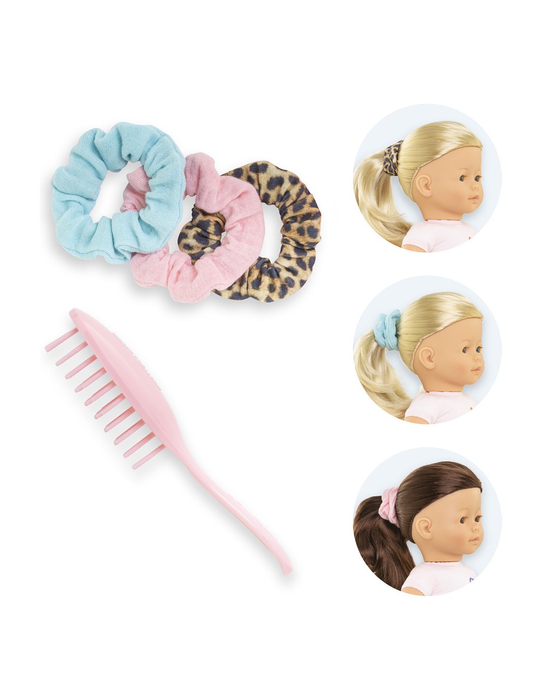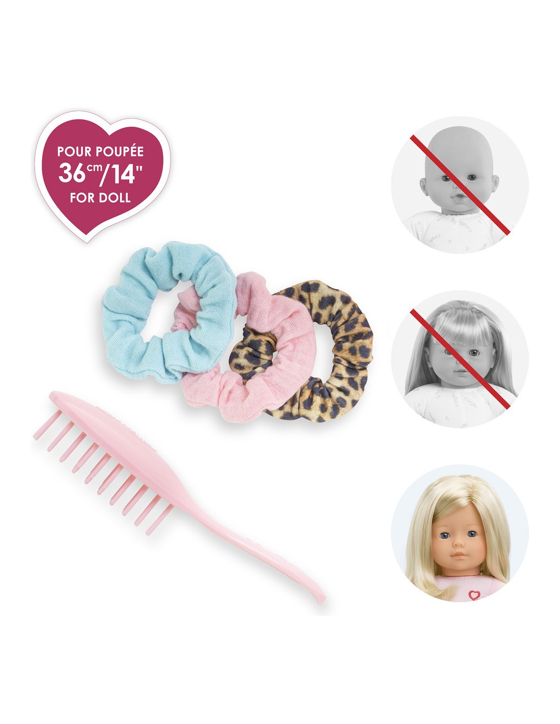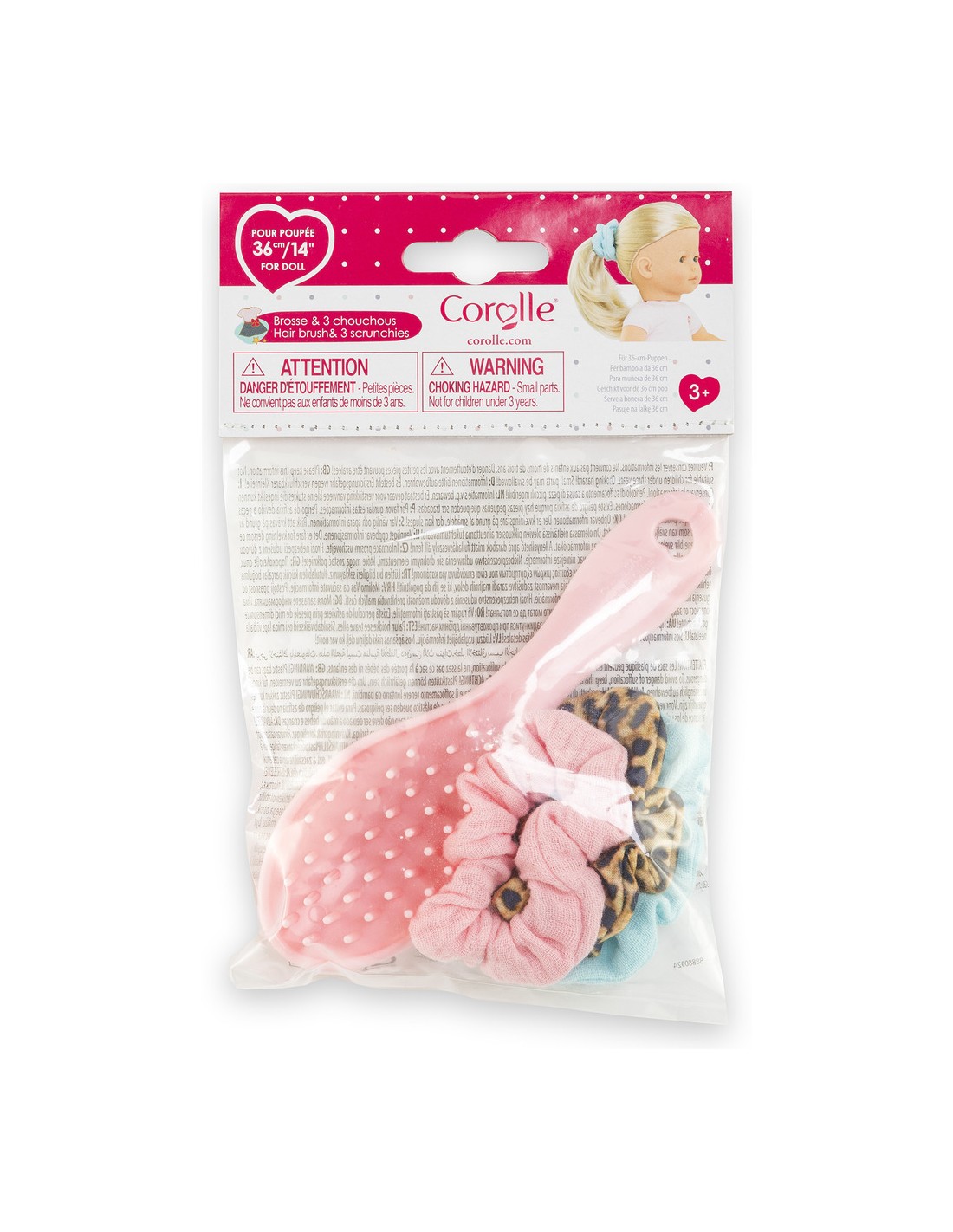 Cet ensemble d'accessoires est composé d'une Brosse à Cheveux et de 3 Chouchous : rose, bleu et à tissu imprimé léopard pour poupée ma Corolle de 36 cm.