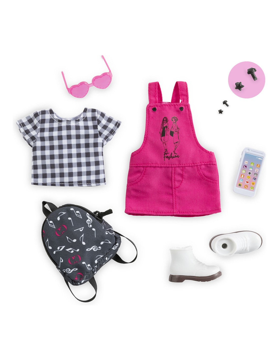 1 paire de lunettes de soleil, 1 paire de boucles d’oreille, 1 T-Shirt, 1 robe salopette, 1 paire de bottes amovibles, 1 sac à dos et 1 téléphone portable (factice)
