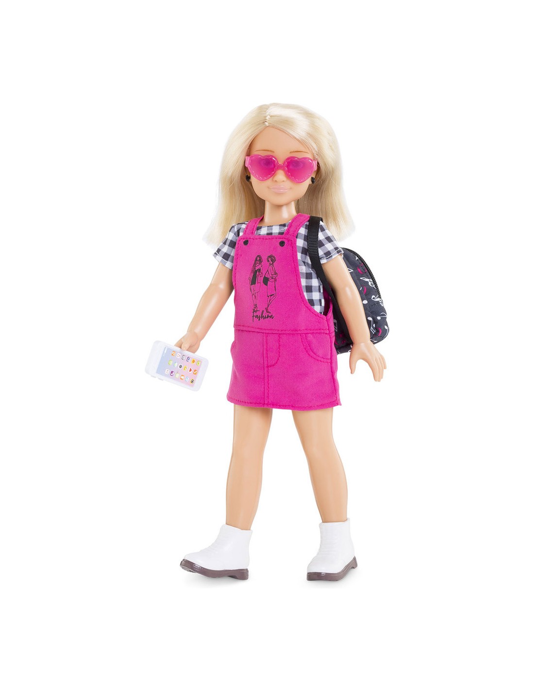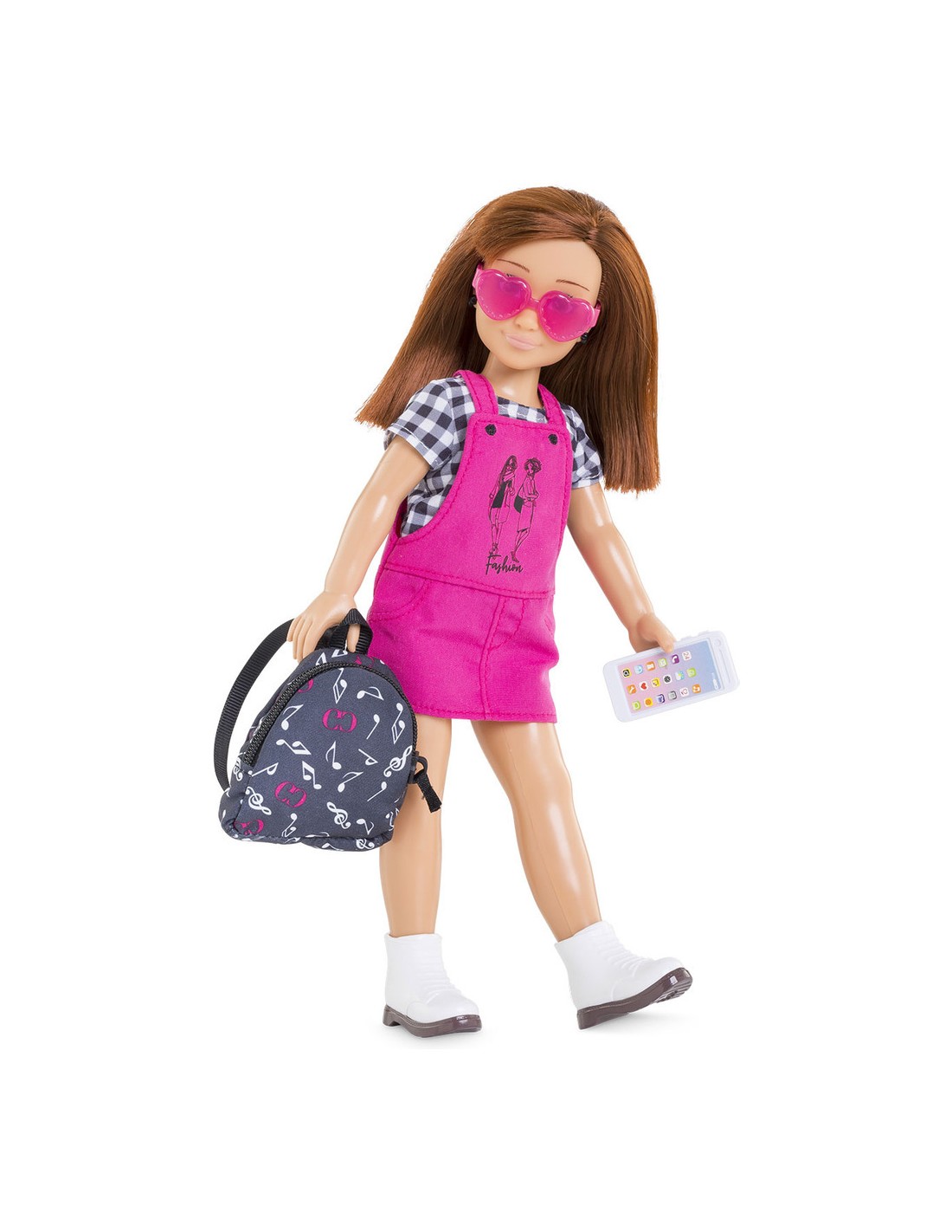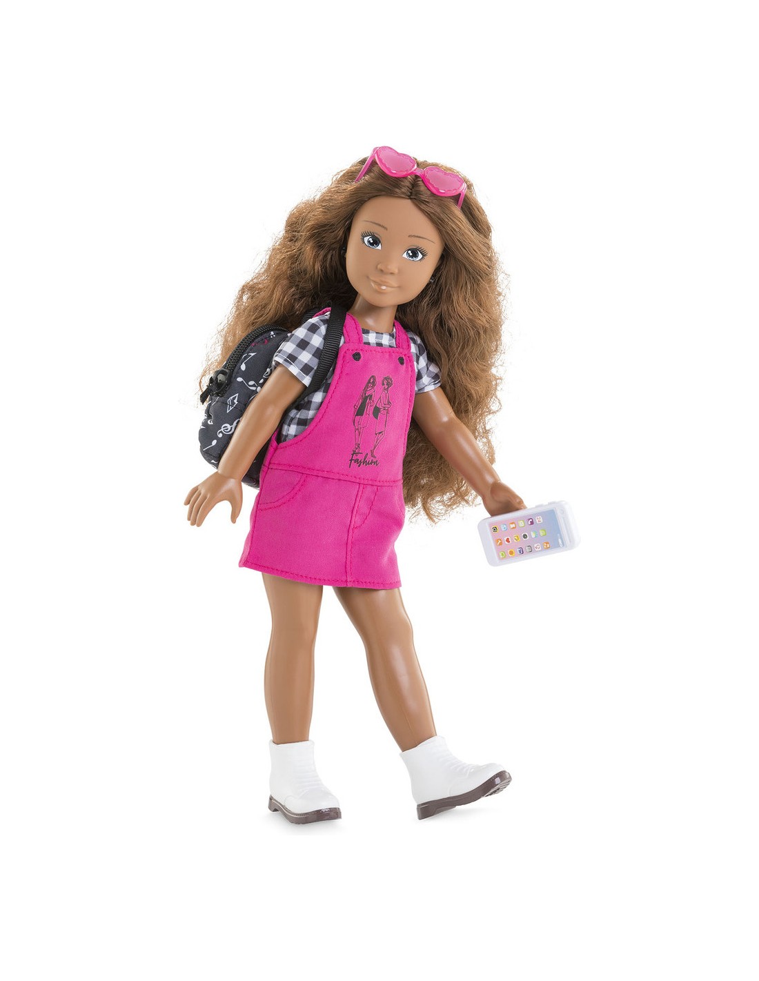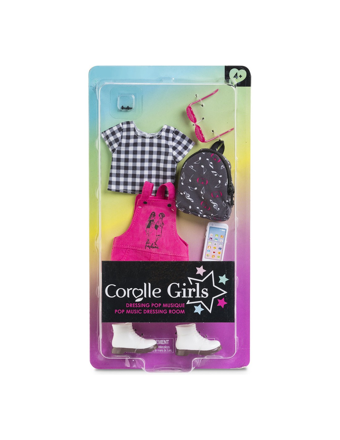 Ce coffret contient1 paire de lunettes de soleil, 1 paire de boucles d’oreille, 1 T-Shirt, 1 robe salopette, 1 paire de bottes amovibles, 1 sac à dos et 1 téléphone portable (factice).Poupée Corolle Girls vendue séparément.