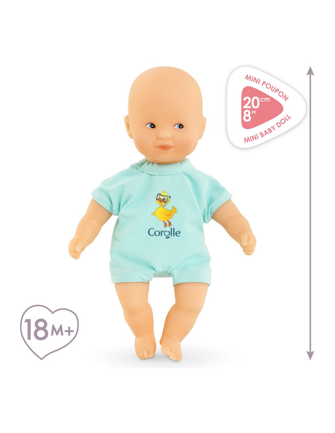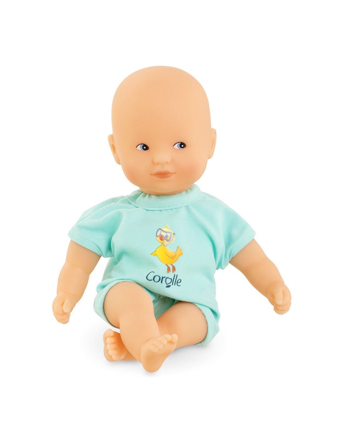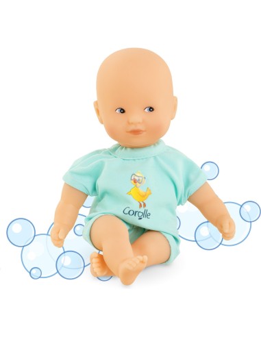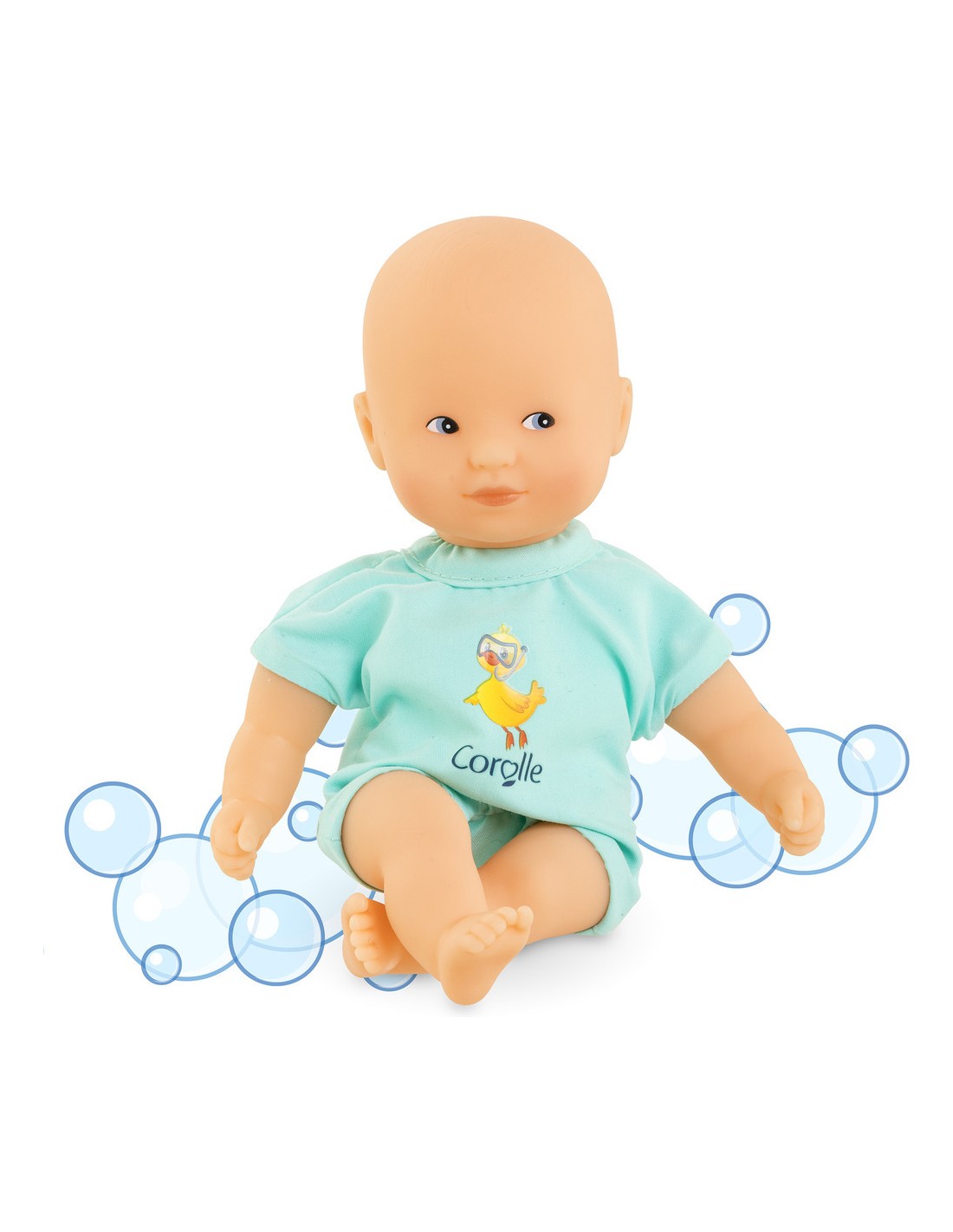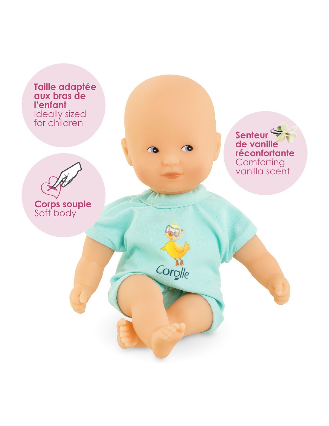 Mini Bain Bleu est un mini poupon de 20 cm. Léger et facile à emmener partout, il est idéal pour accompagner le bain quotidien de l'enfant et les baignades à la piscine et à la mer.