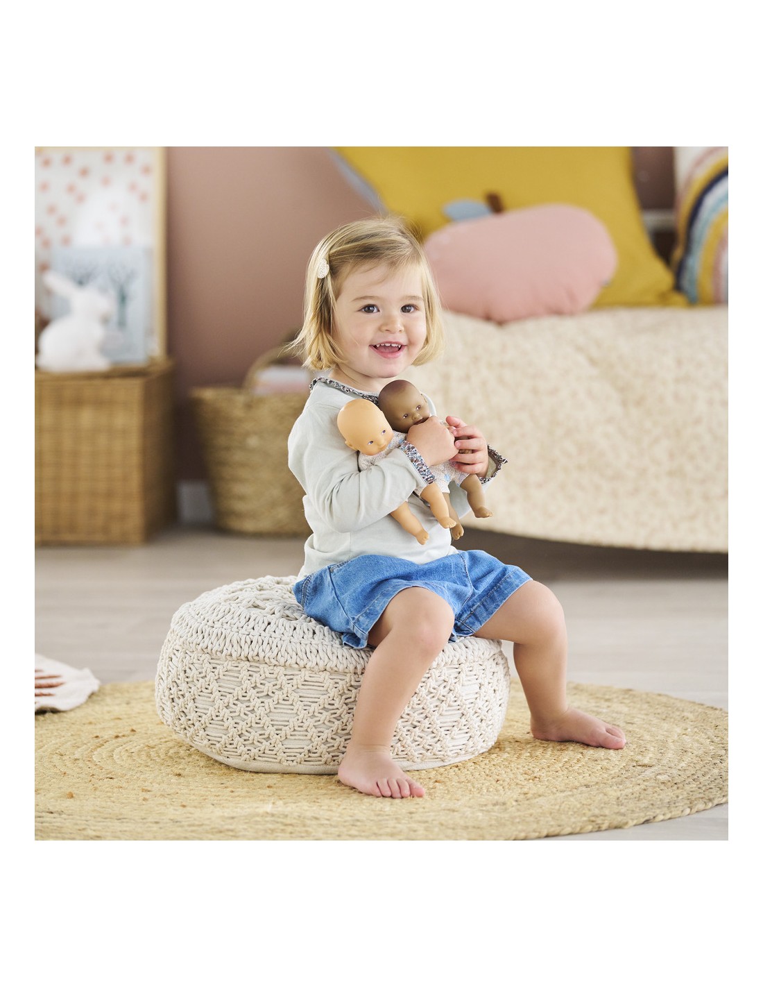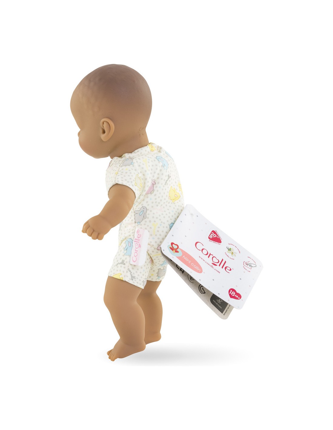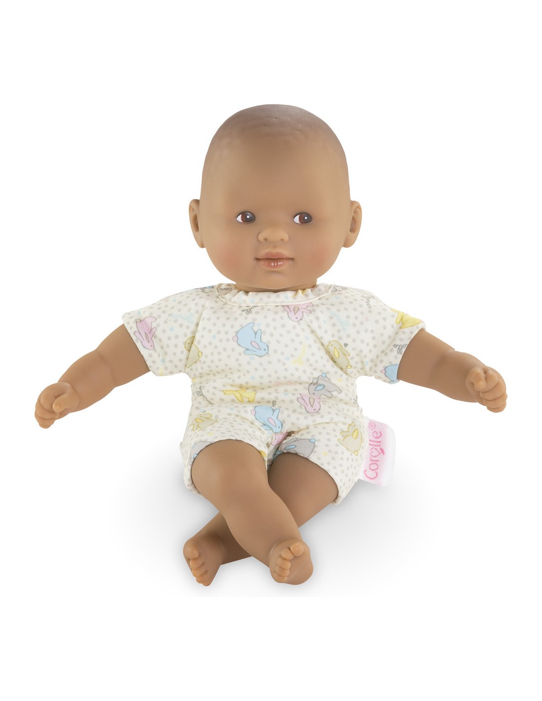 Mini Calin Lapins Yeux Marron, un adorable compagnon de voyage ! Mini Calin est un mini poupon de 20 cm léger et facile à emmener partout. Ce petit poupon à la peau mate et les yeux marron, peints sur son visage. Son visage, ses bras et ses jambes, à la délicate senteur de vanille, sont en vinyle doux au toucher. Il possède une jolie toile de corps à imprimé lapins.