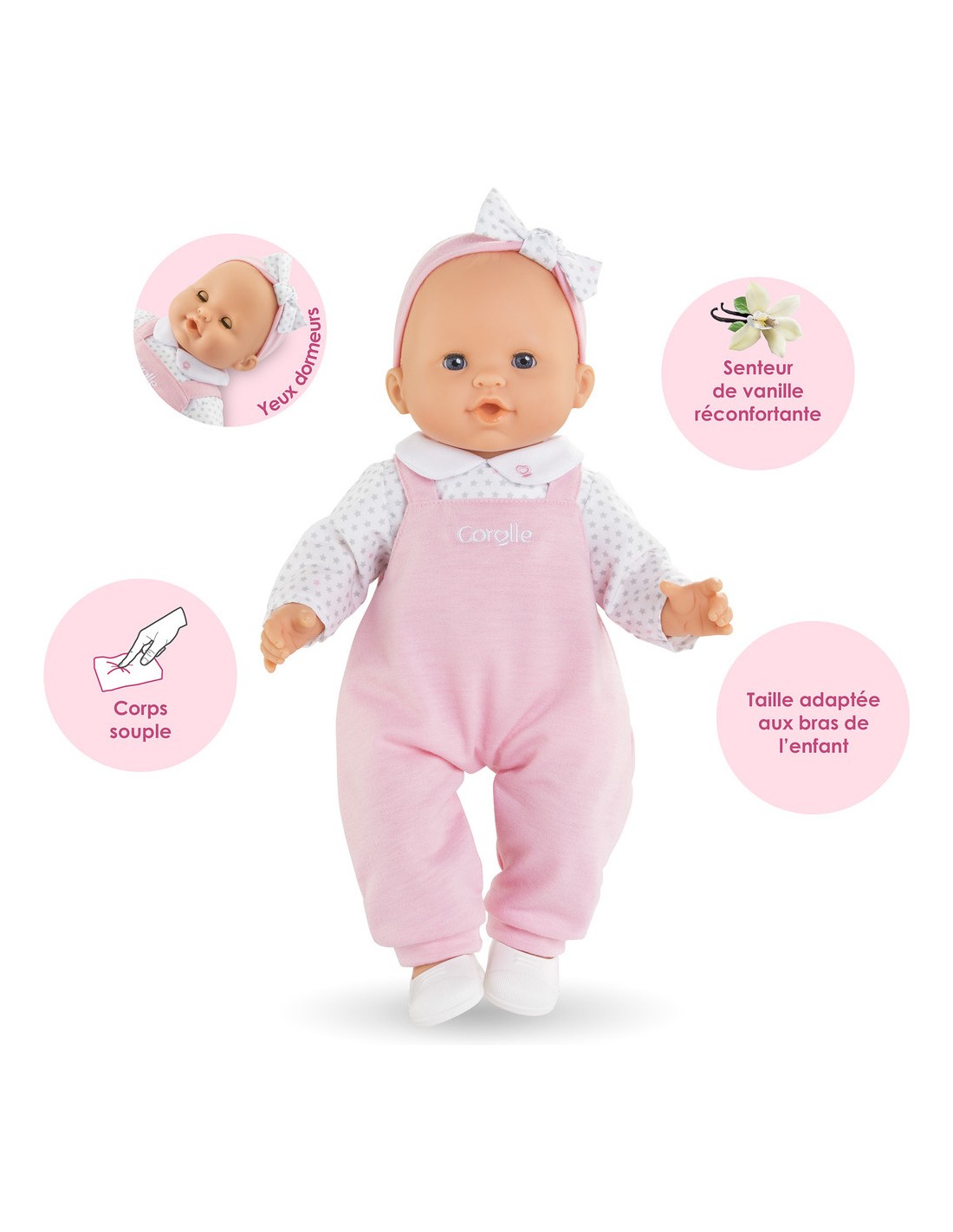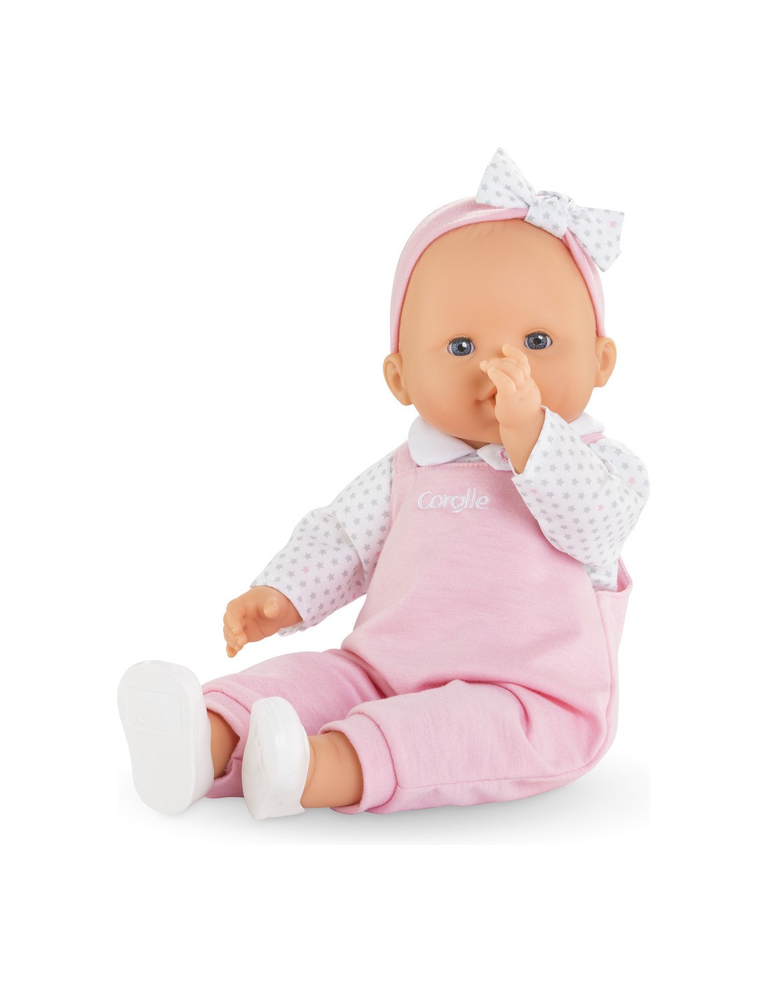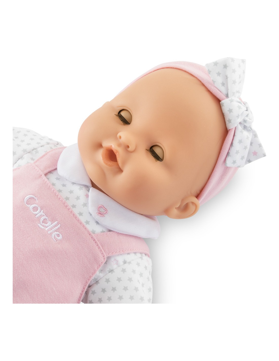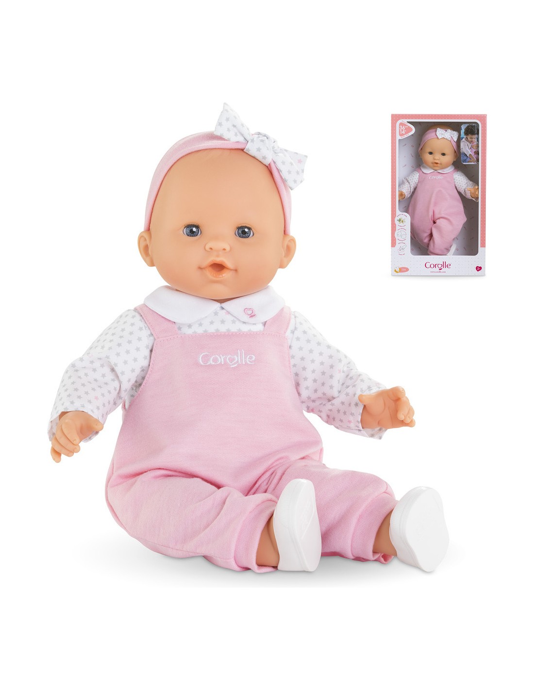 Lise est habillée d’une jolie salopette rose et d'un polo blanc à manches longues, au motif étoilé avec un col claudine. Pour parfaire sa tenue, Lise est coiffée d’un bandeau rose au noeud étoilé assorti et elle porte une paire de ballerines blanches. Lise dispose d'une collection complète de vêtements et d'accessoires dans la gamme mon grand poupon Corolle, pour imiter les gestes du quotidien et s'inventer des scénarios de jeu multiples et variés.