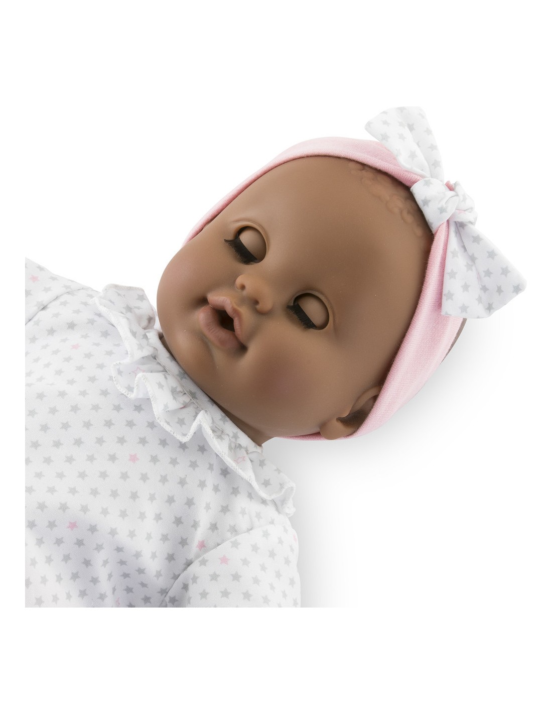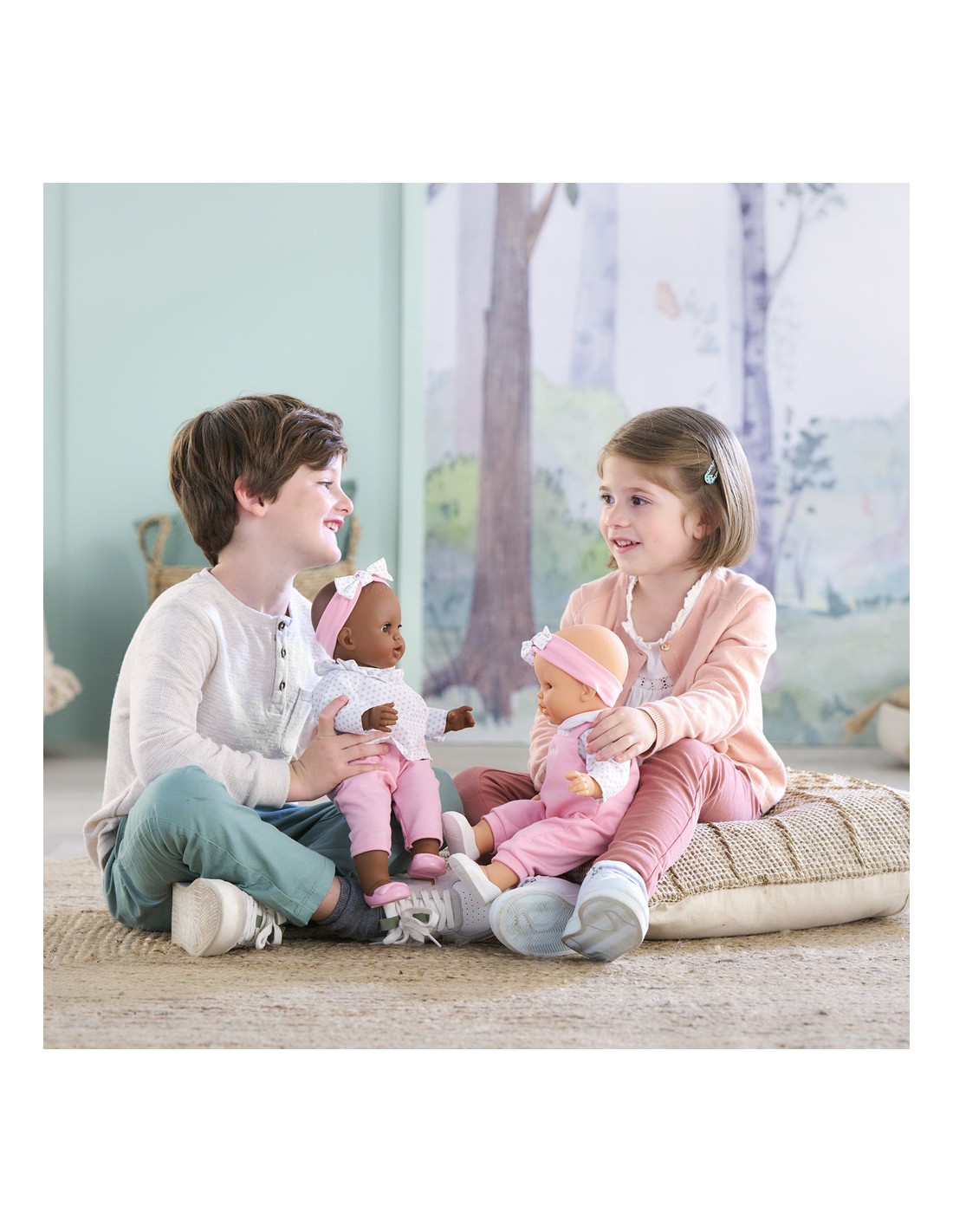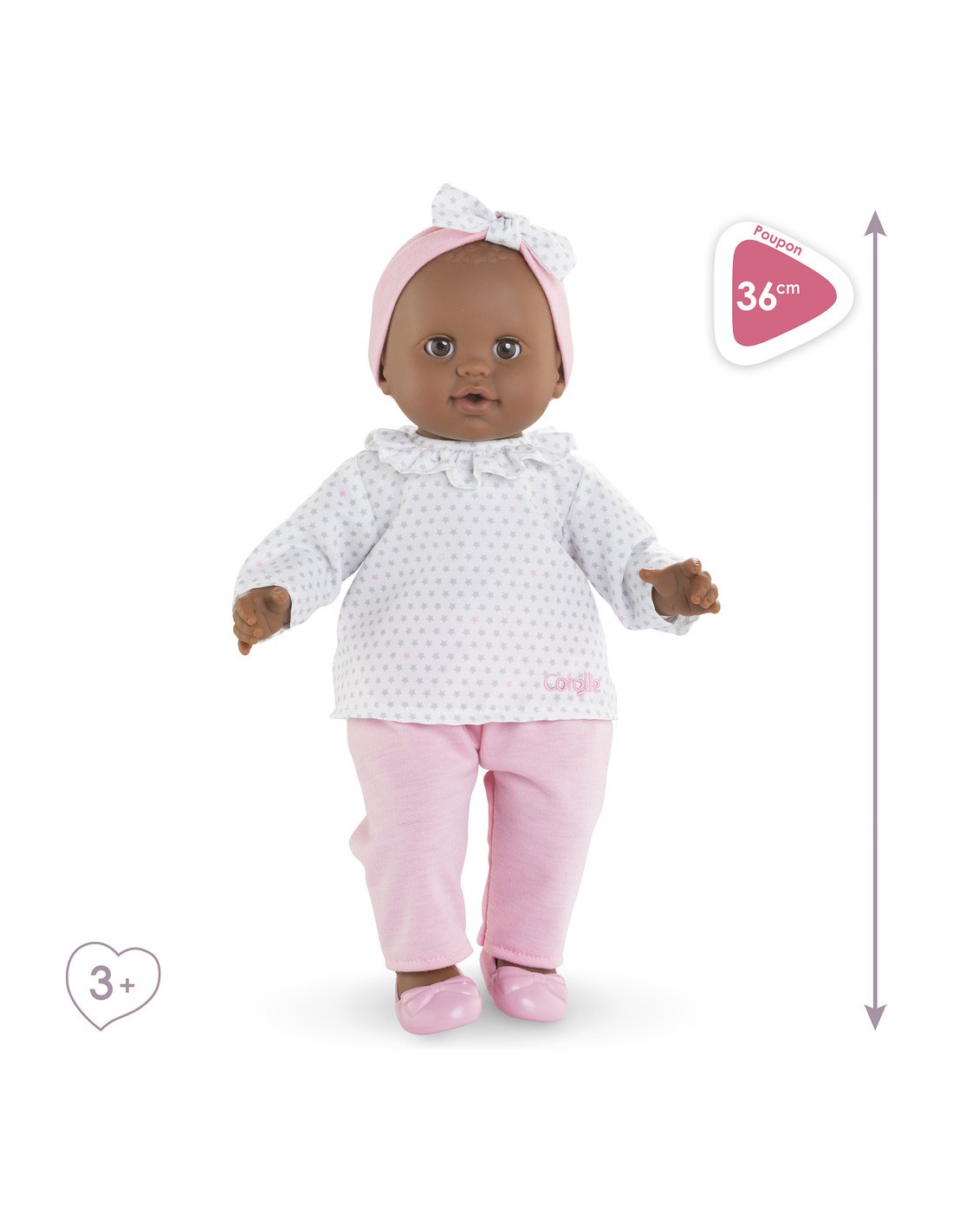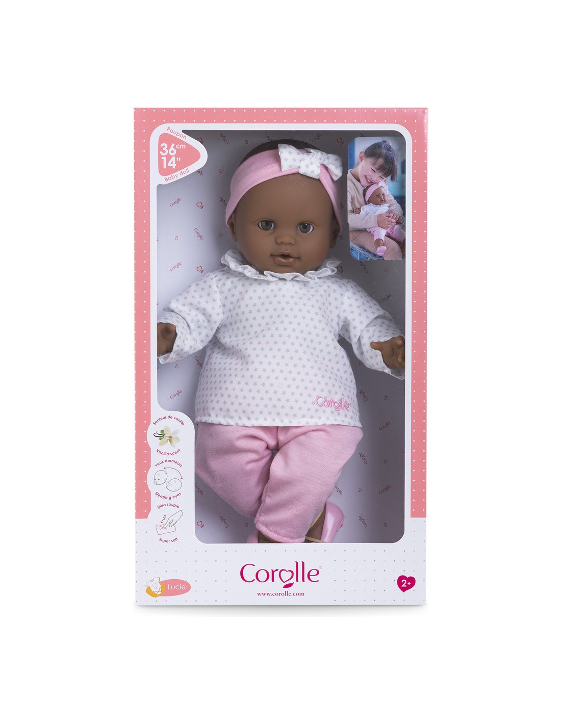 Elle est habillée d’un joli pantalon rose et d'une blouse blanche à motifs étoiles à manches longues. Pour parfaire sa tenue, Lucie est coiffée d’un bandeau rose assorti et porte une paire de ballerines roses. Lucie dispose d'une collection complète de vêtements et d'accessoires dans la gamme mon grand poupon Corolle, pour imiter les gestes du quotidien et s'inventer des scénarios de jeu multiples et variés.