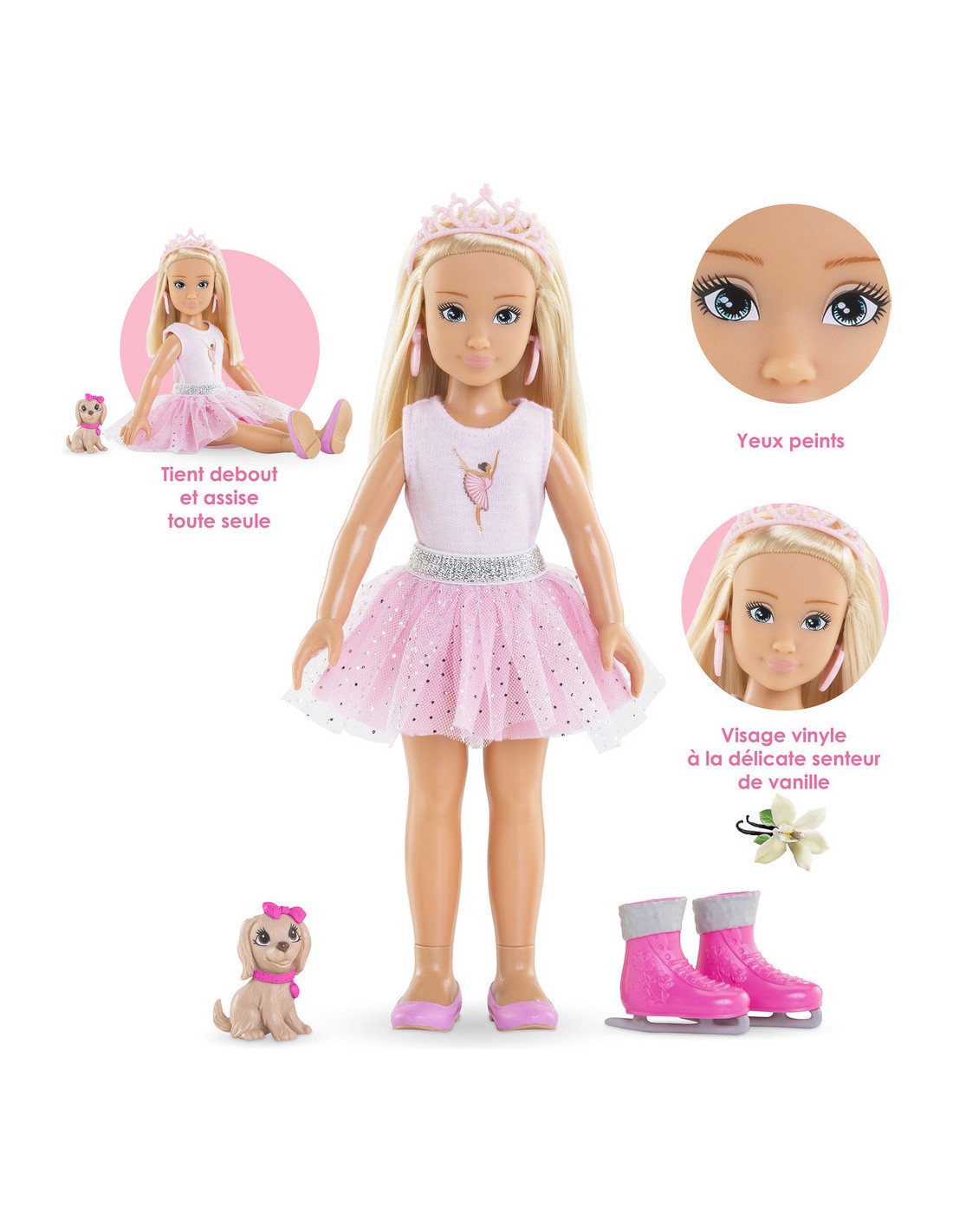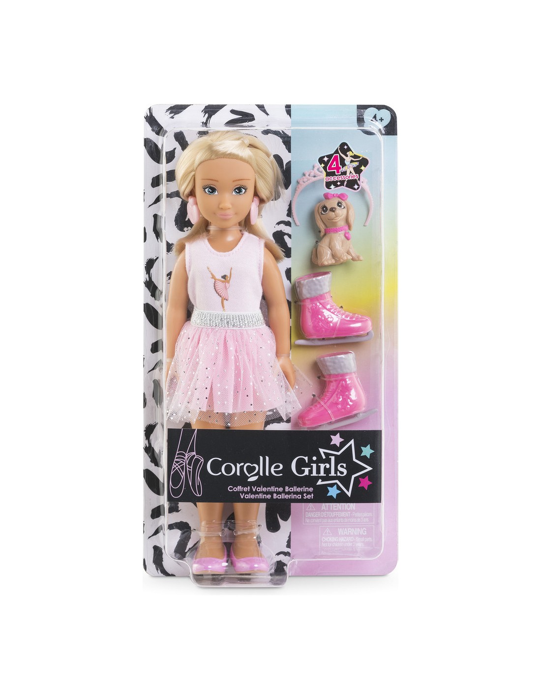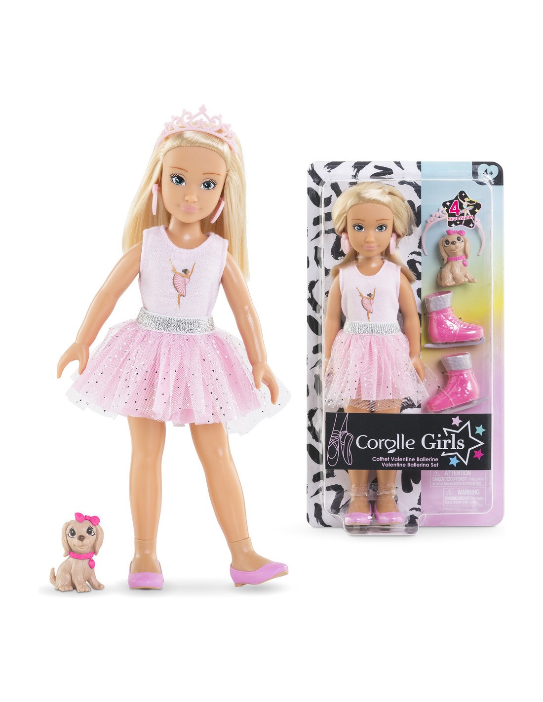 Le coffret Valentine Ballerine est composé d'une poupée mannequin Valentine, mesurant de 28 cm, et de 4 accessoires : une paire de patins à glace, un chien, un diadème et une paire de boucles d'oreilles. Valentine a un joli visage naturel qui sent bon la vanille. Ses yeux bleus sont peints et elle a les cheveux blonds. Elle porte une tenue de danseuse rose avec un justaucorps, un tutu et une paire de pieds-ballerines amovibles pour s’adonner à sa passion : la danse classique.
