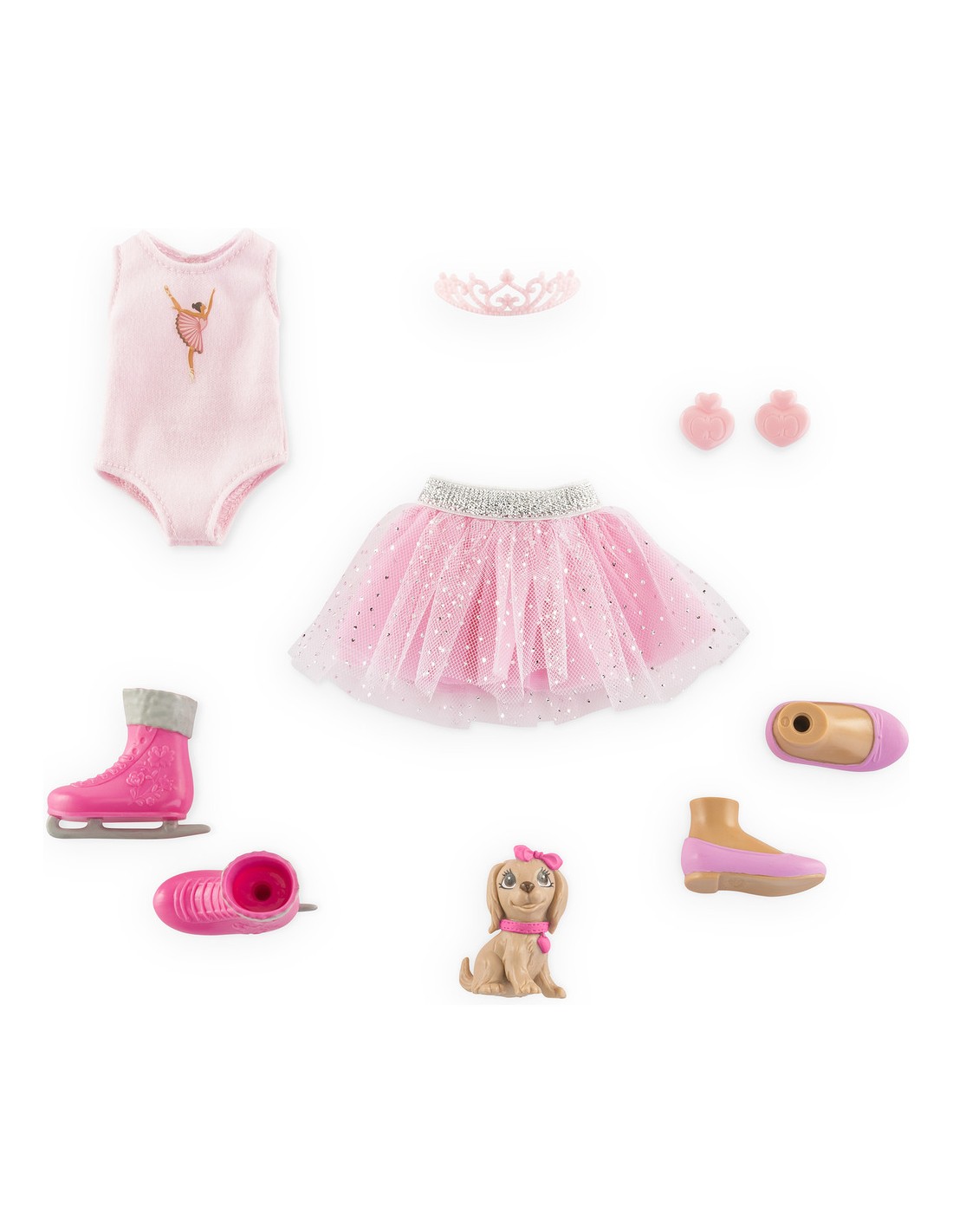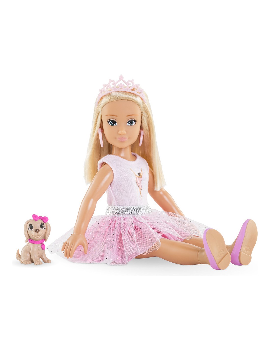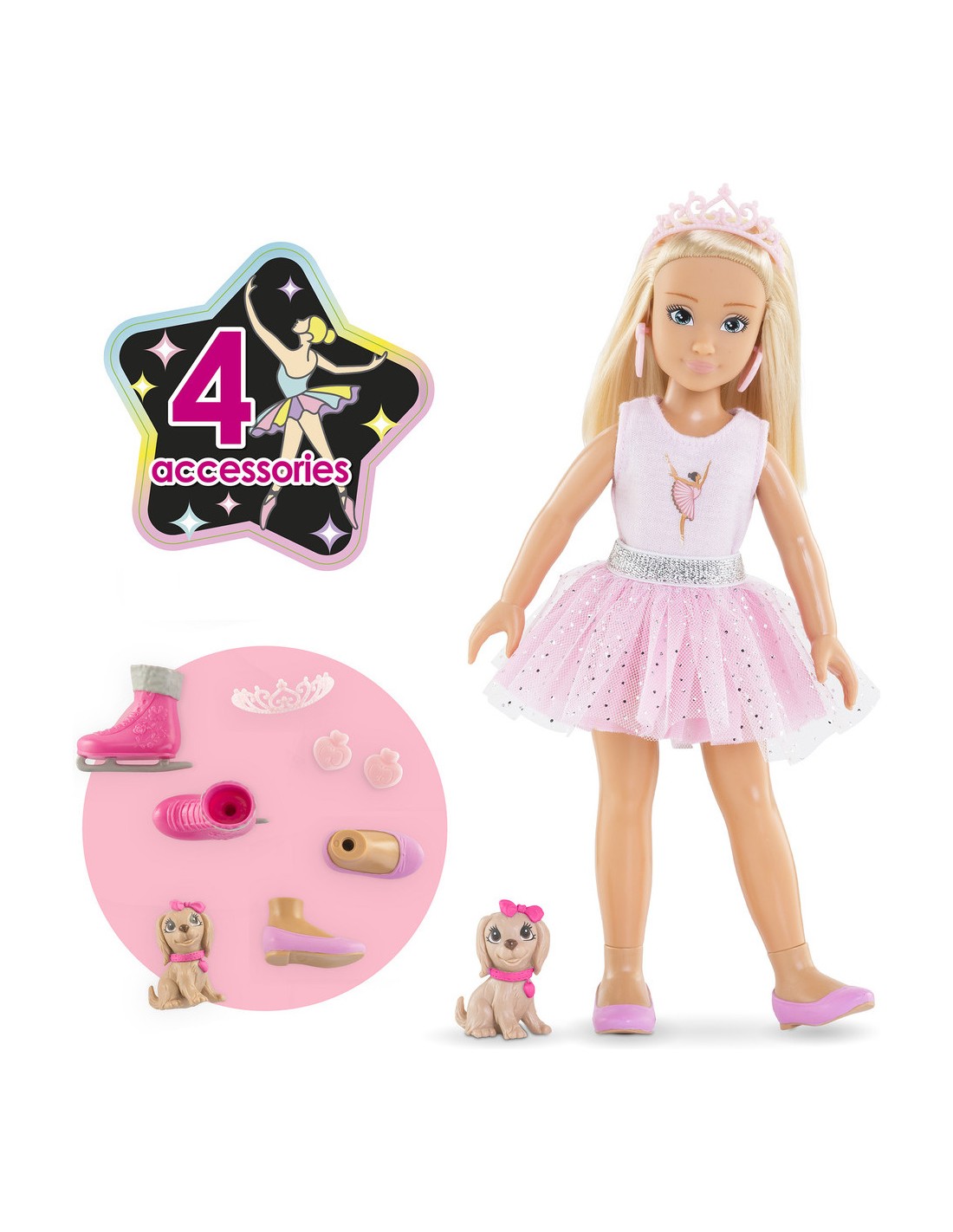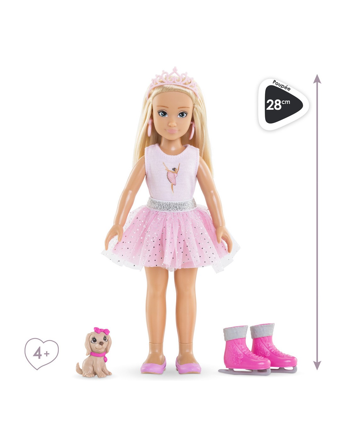 Le coffret Valentine Ballerine est composé d'une poupée mannequin Valentine, mesurant de 28 cm, et de 4 accessoires : une paire de patins à glace, un chien, un diadème et une paire de boucles d'oreilles. Valentine a un joli visage naturel qui sent bon la vanille. Ses yeux bleus sont peints et elle a les cheveux blonds. Elle porte une tenue de danseuse rose avec un justaucorps, un tutu et une paire de pieds-ballerines amovibles pour s’adonner à sa passion : la danse classique.
