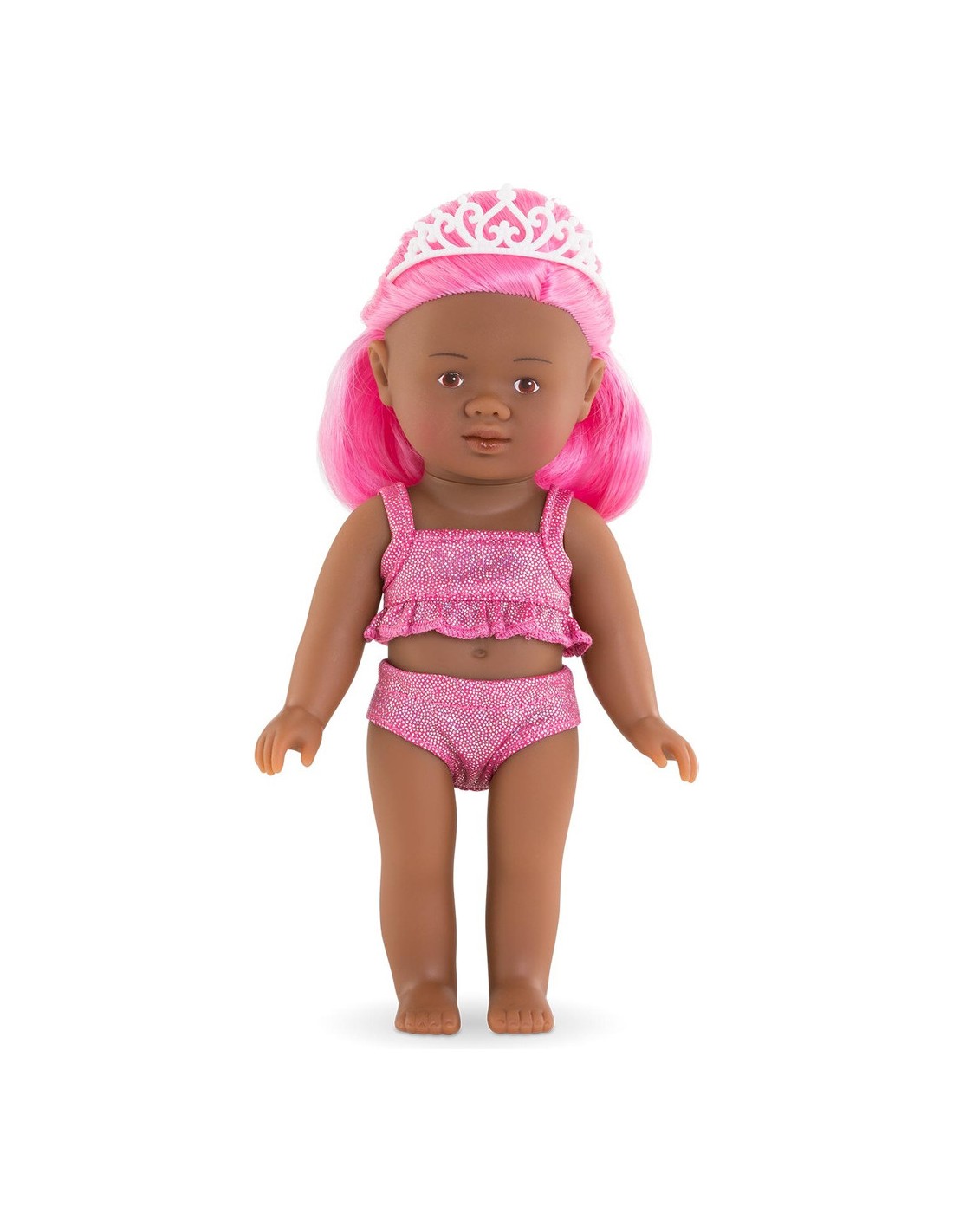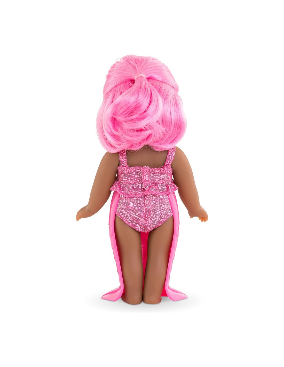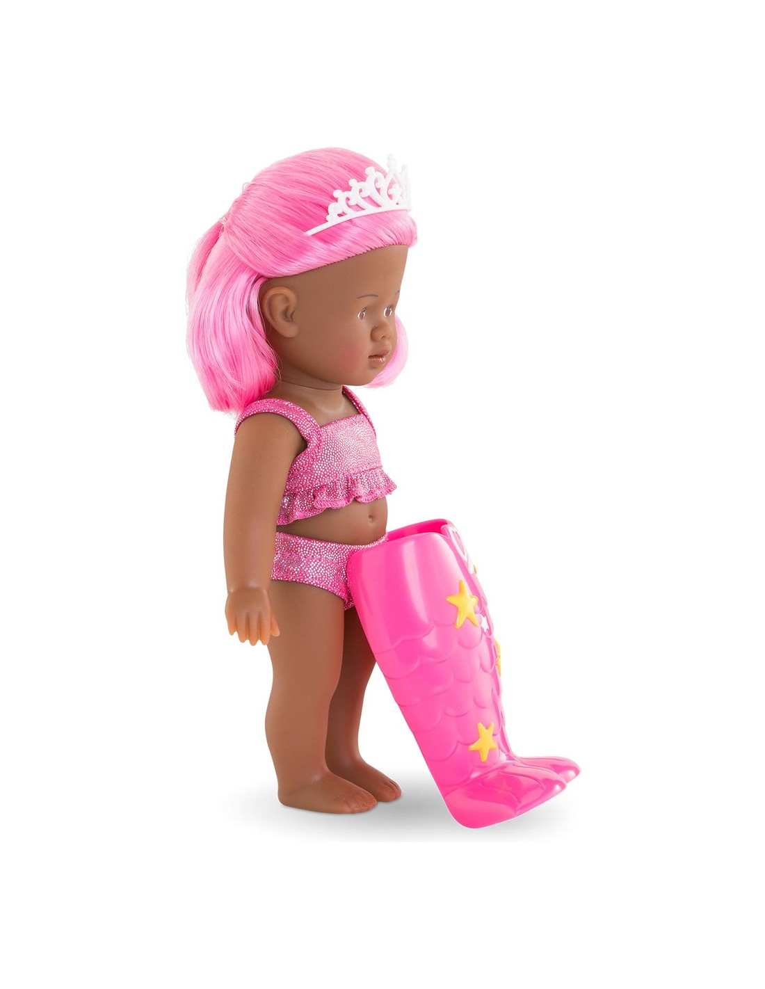 Elle a un corps tout en vinyle doux au toucher et à la délicate senteur de vanille. Cette Mini Sirène a la peau noire et ses yeux marron sont peints. Elle a des cheveux fucshia.