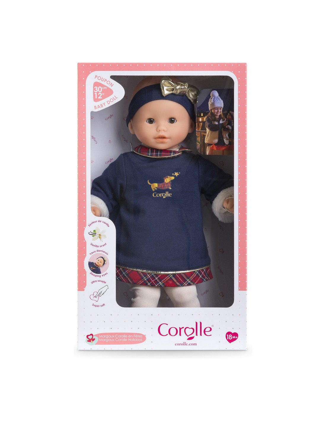 Avec ses yeux dormeurs, il fait dodo quand on le couche sur le dos. Bébé Calin Margaux Corolle en Fêtes est un petit poupon à la peau claire et aux yeux marron.