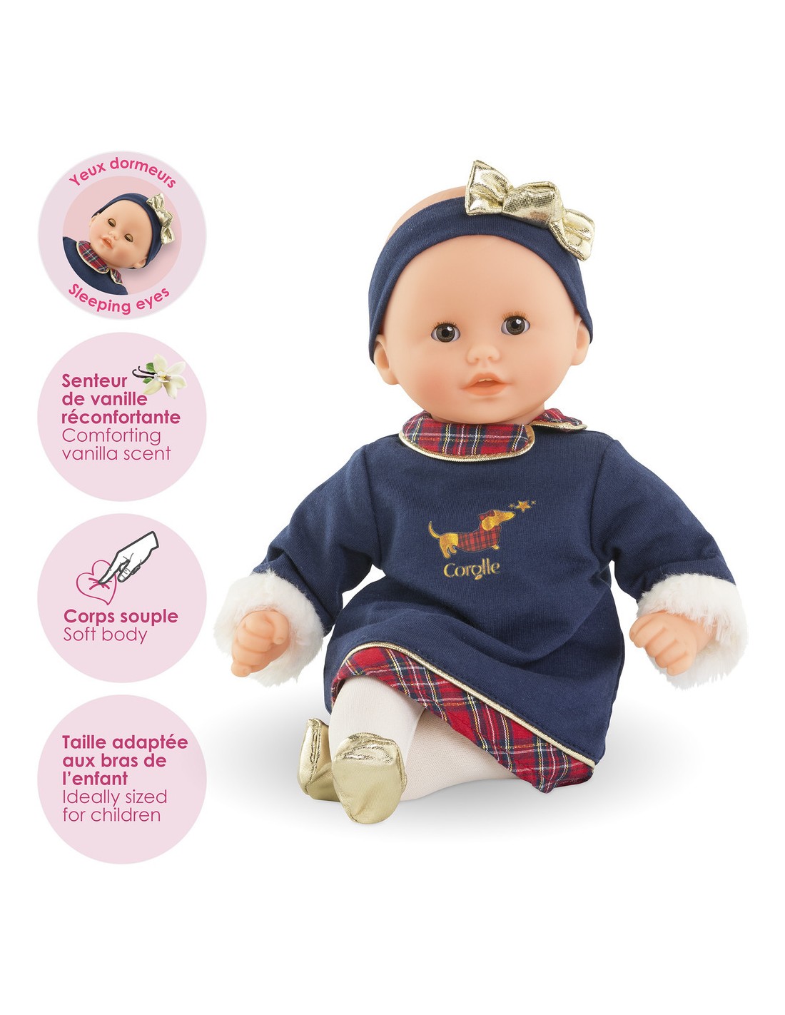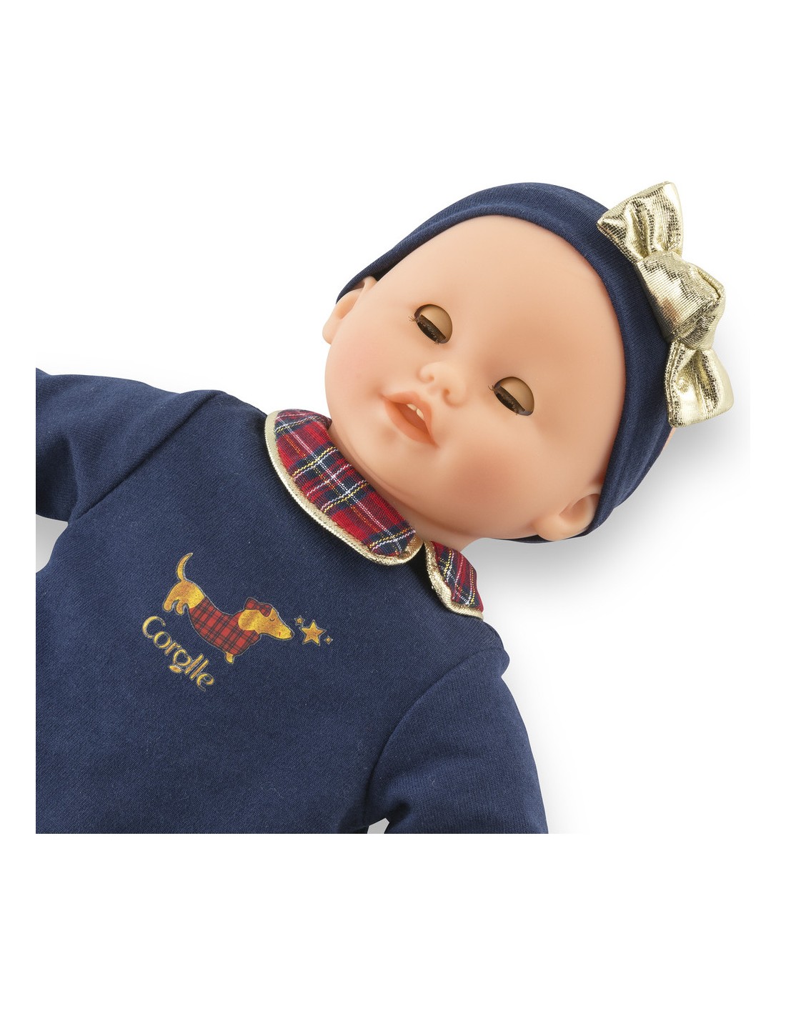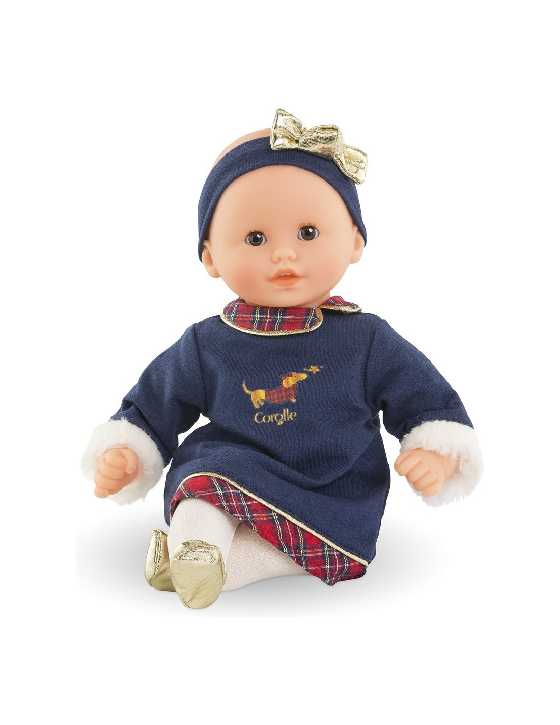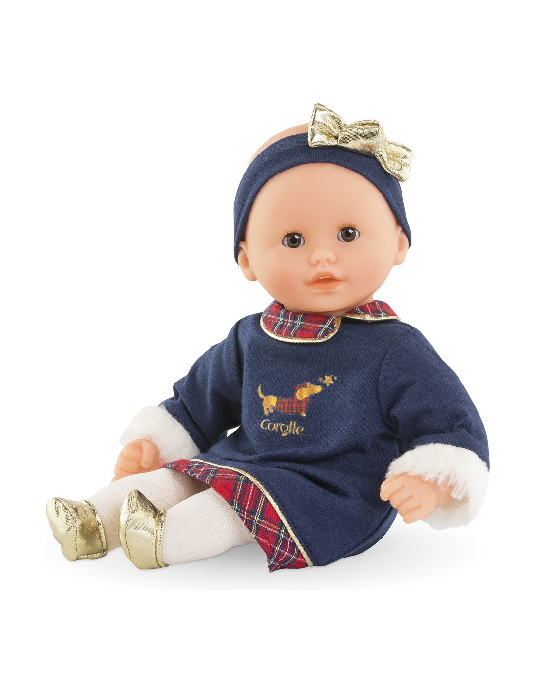 Une sérigraphie pailletée d'un petit teckel en manteau écossais ajoute une note adorable. Pour compléter sa tenue, Bébé Calin Margaux Corolle en Fêtes porte un ensemble collant couleur crème et des ballerines dorées tout-un. Il est coiffé d'un bandeau assorti avec un nœud doré élégant.