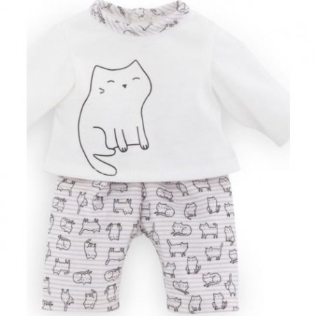 Le pyjama est composé de deux pièces. Une chemise blanche avec un col gris avec un chat dessus et un pantalon gris à motif chat. Pour le dodo, choisissez ce doux pyjama 2 pièces blanc à motif chat pour endormir votre poupée.