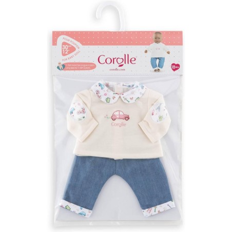 Pour une tenue décontractée, l'ensemble T-shirt Manches Longues et Jean Week-End À Paris est le vêtement idéal pour les petits poupons de 30 cm mon premier poupon Corolle. Composé d'un haut crème et d'un pantalon bleu imitation denim, cet ensemble allie douceur et praticité pour un look casual et tendance.