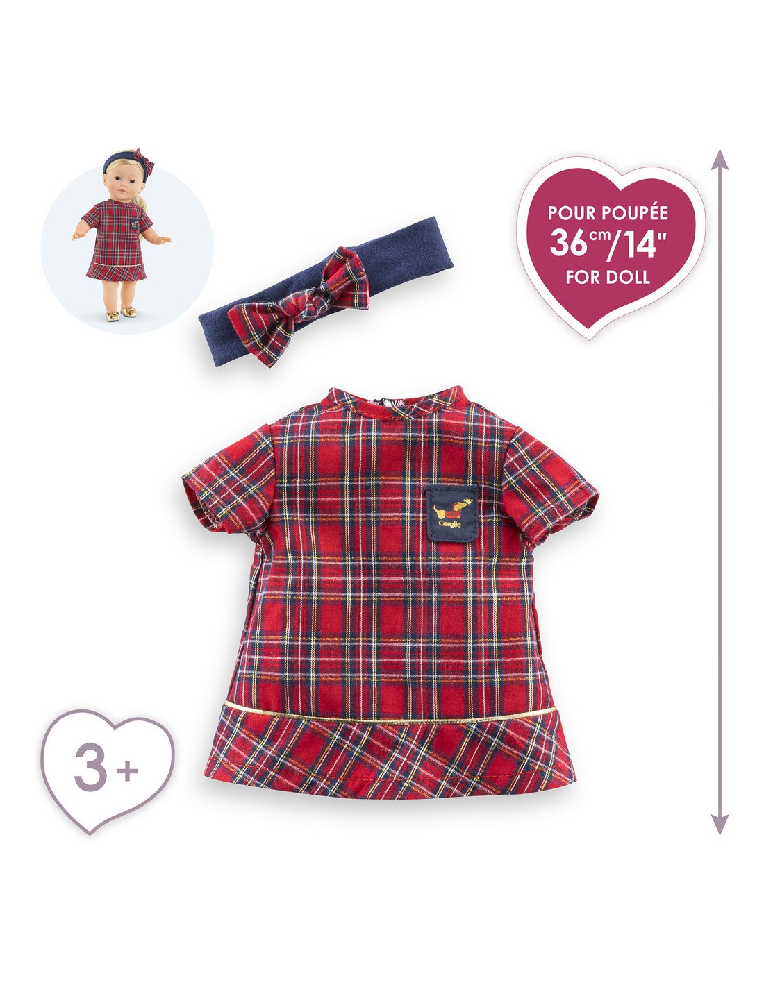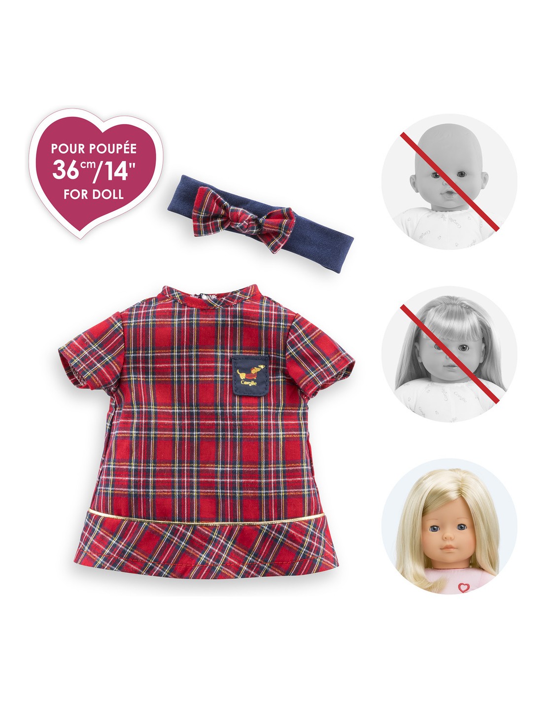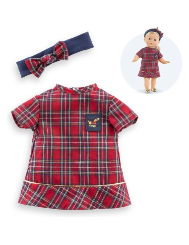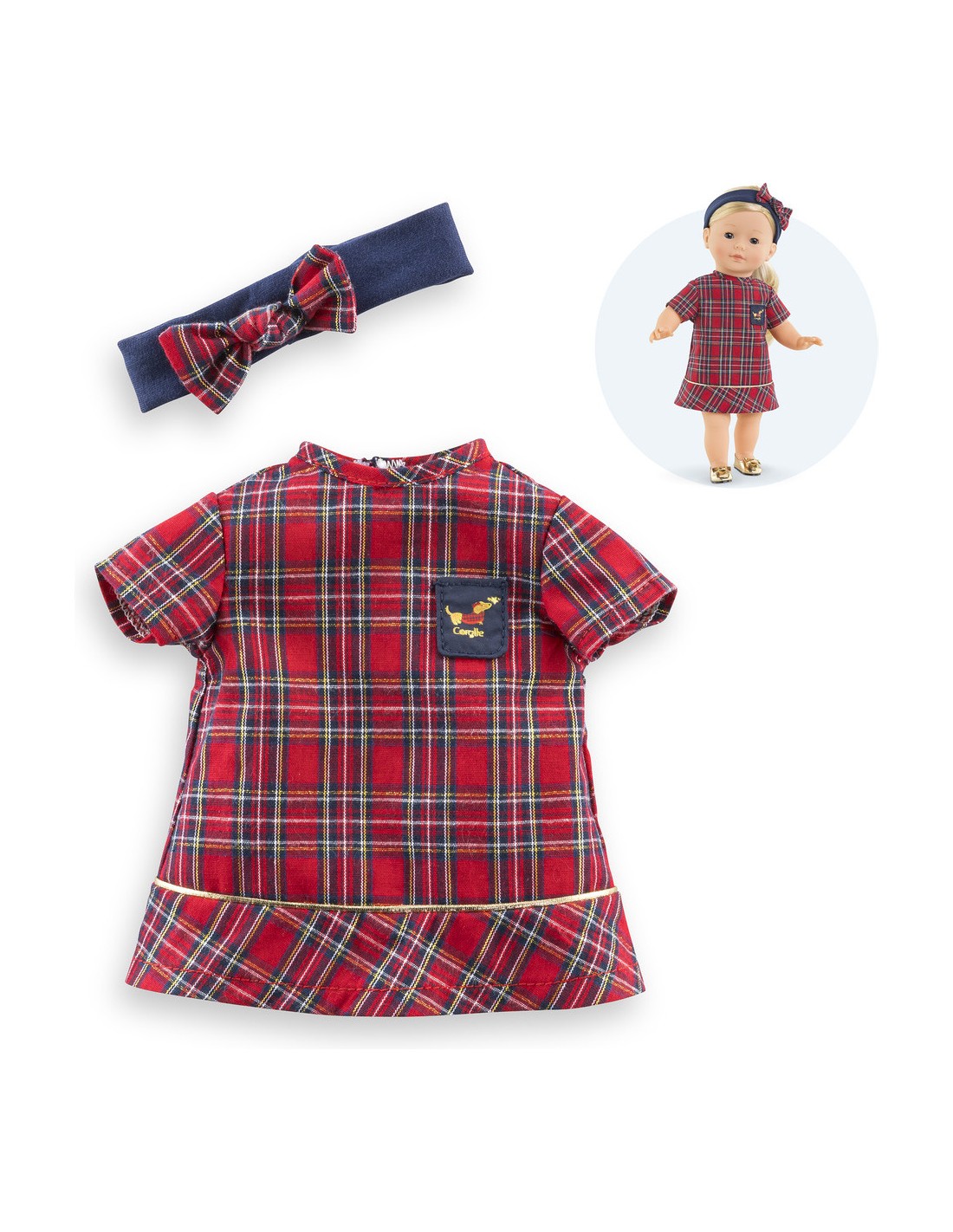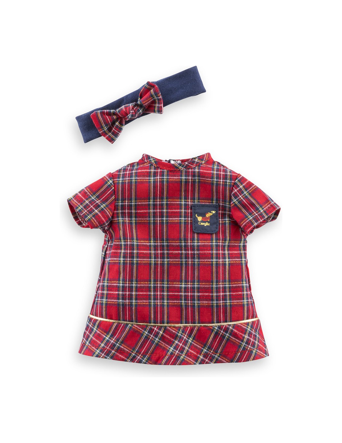 Confectionnée dans des matières douces et résistantes, elle est facile à enfiler. Cette robe a été réalisée dans un tissu écossais rouge et bleu marine. Elle est assortie avec un bandeau pour mettre dans les cheveux d'une poupée ma Corolle. De petits détails dorés ainsi qu'une petite poche cousue bleu marine avec une sérigraphie pailletée d'un petit chien "Teckel" viennent parfaire cette tenue.