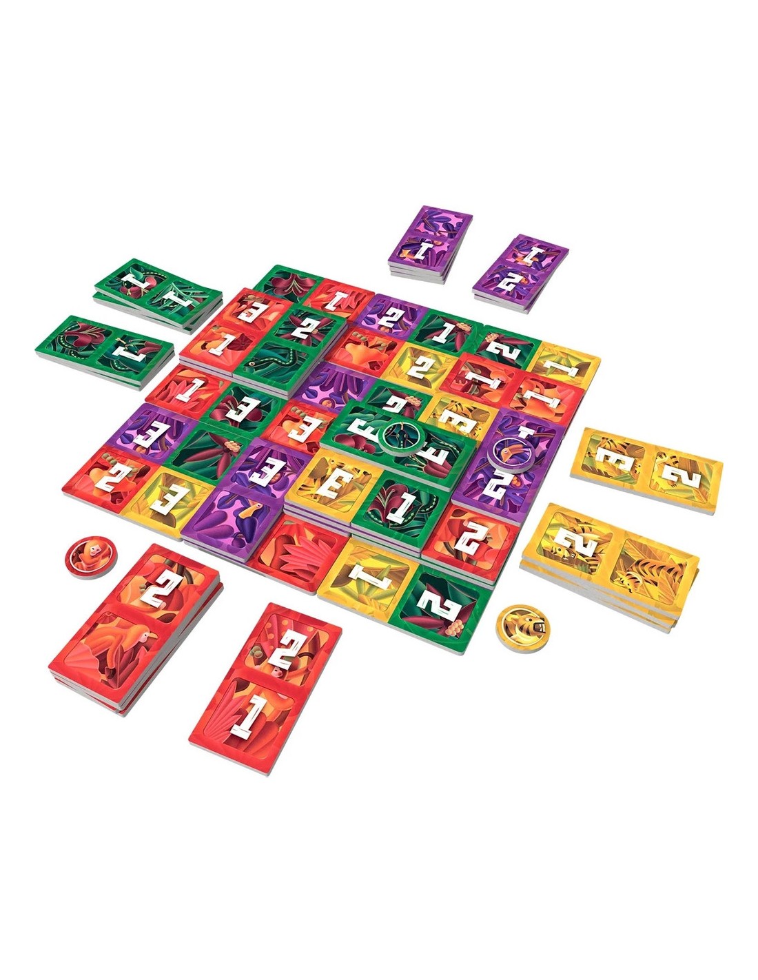 Contenu : 40 dominos, 9 tuiles plateau, 4 jetons totem et 1 livret de règles. Matériel double face.
