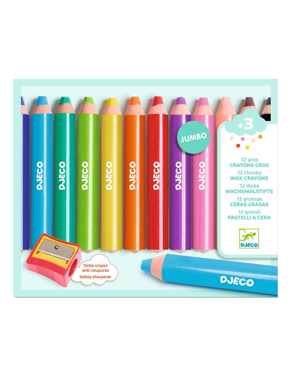 Contenu : 12 gros crayons gras et 1 taille-crayons adapté et anti-coupures.