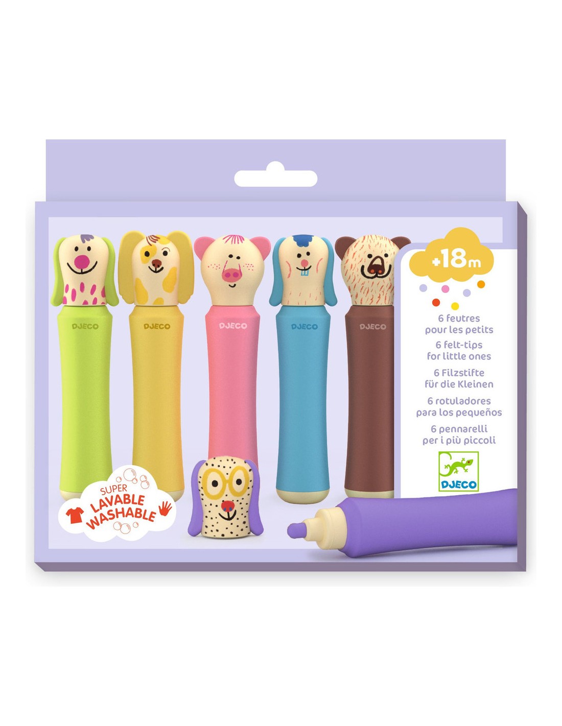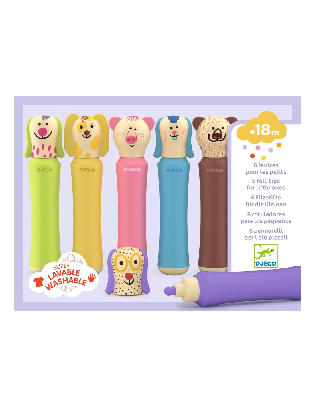 6 feutres super lavables, avec mines résistantes et une prise en main parfaite pour les plus petits… et des capuchons en forme d’animaux rigolos.
