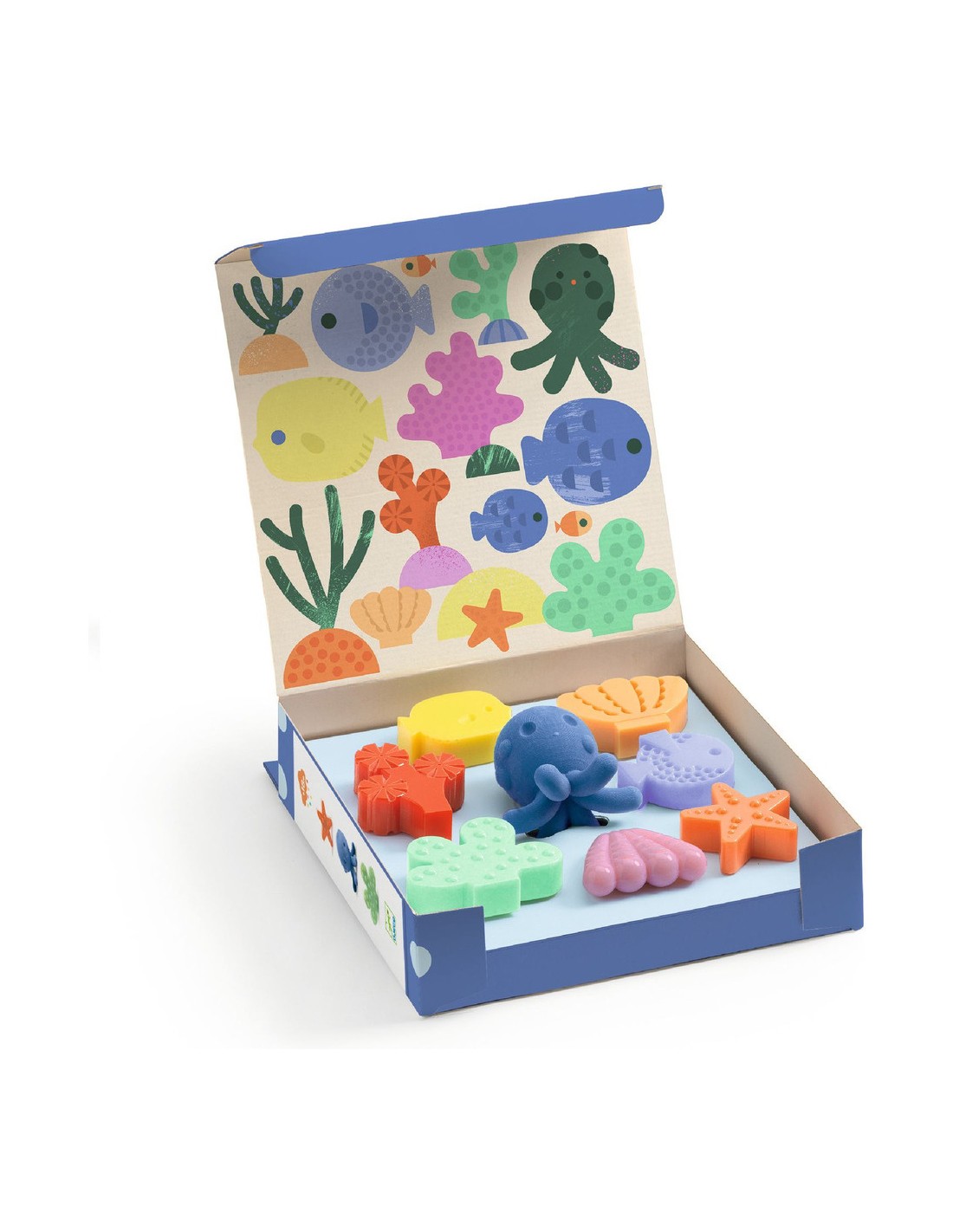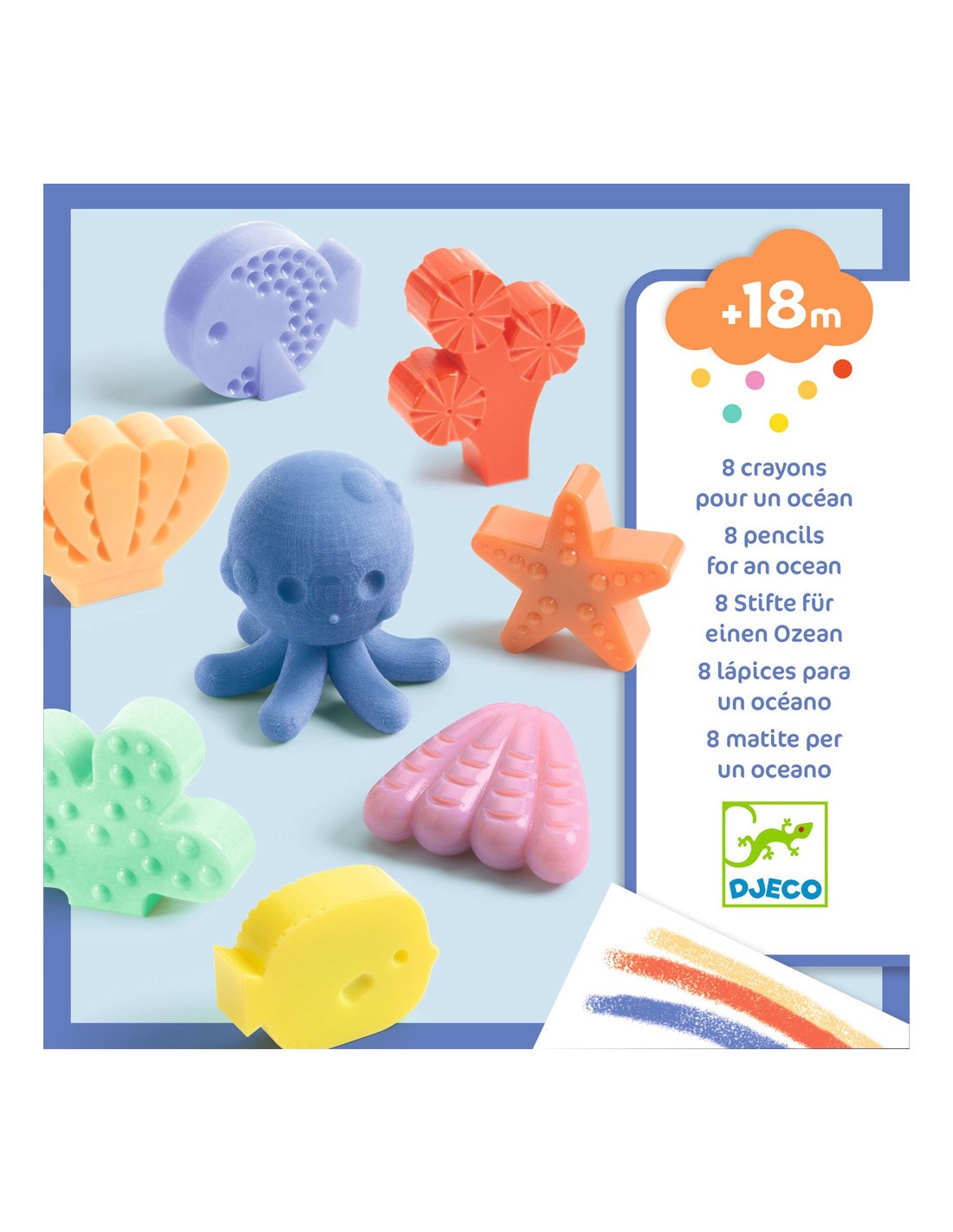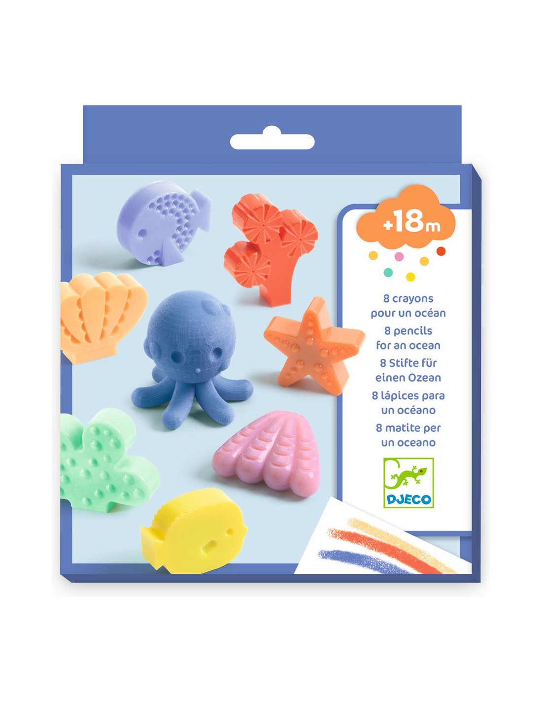 8 crayons pensés pour les petites mains. Des formes ludiques et rigolotes pour inventer un océan plein de vie : des crayons pour jouer, explorer et dessiner… sans aucune tache !