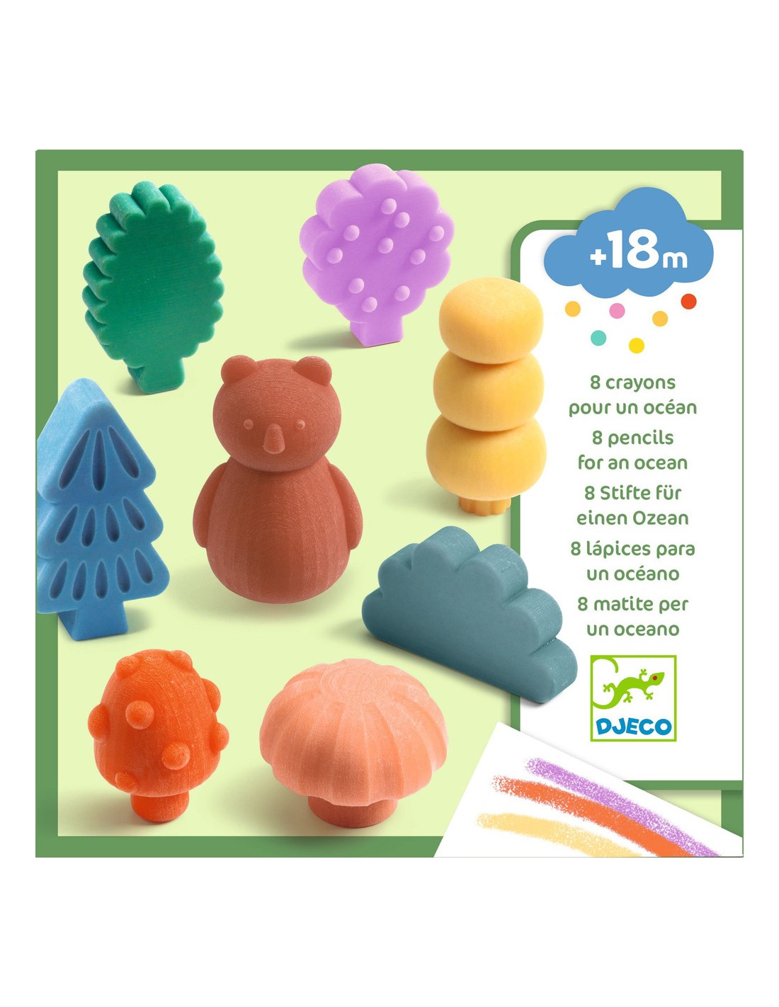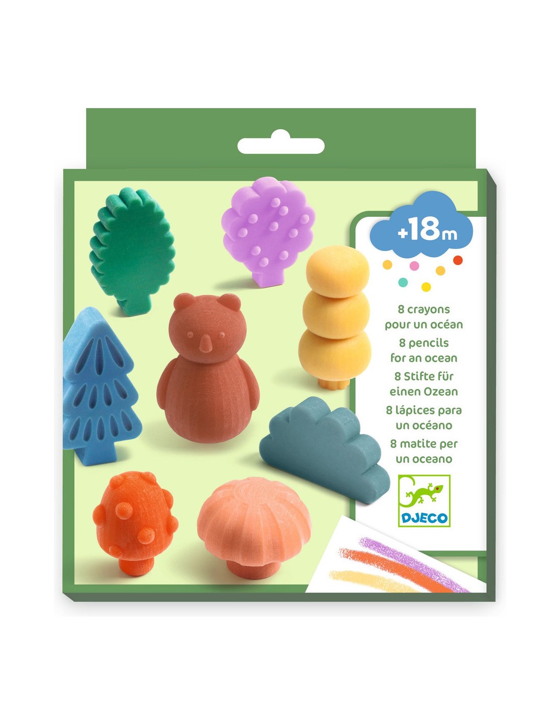 8 crayons pensés pour les petites mains. Des formes ludiques et rigolotes pour inventer une forêt pleine de vie : des crayons pour jouer, explorer et dessiner… sans aucune tache !