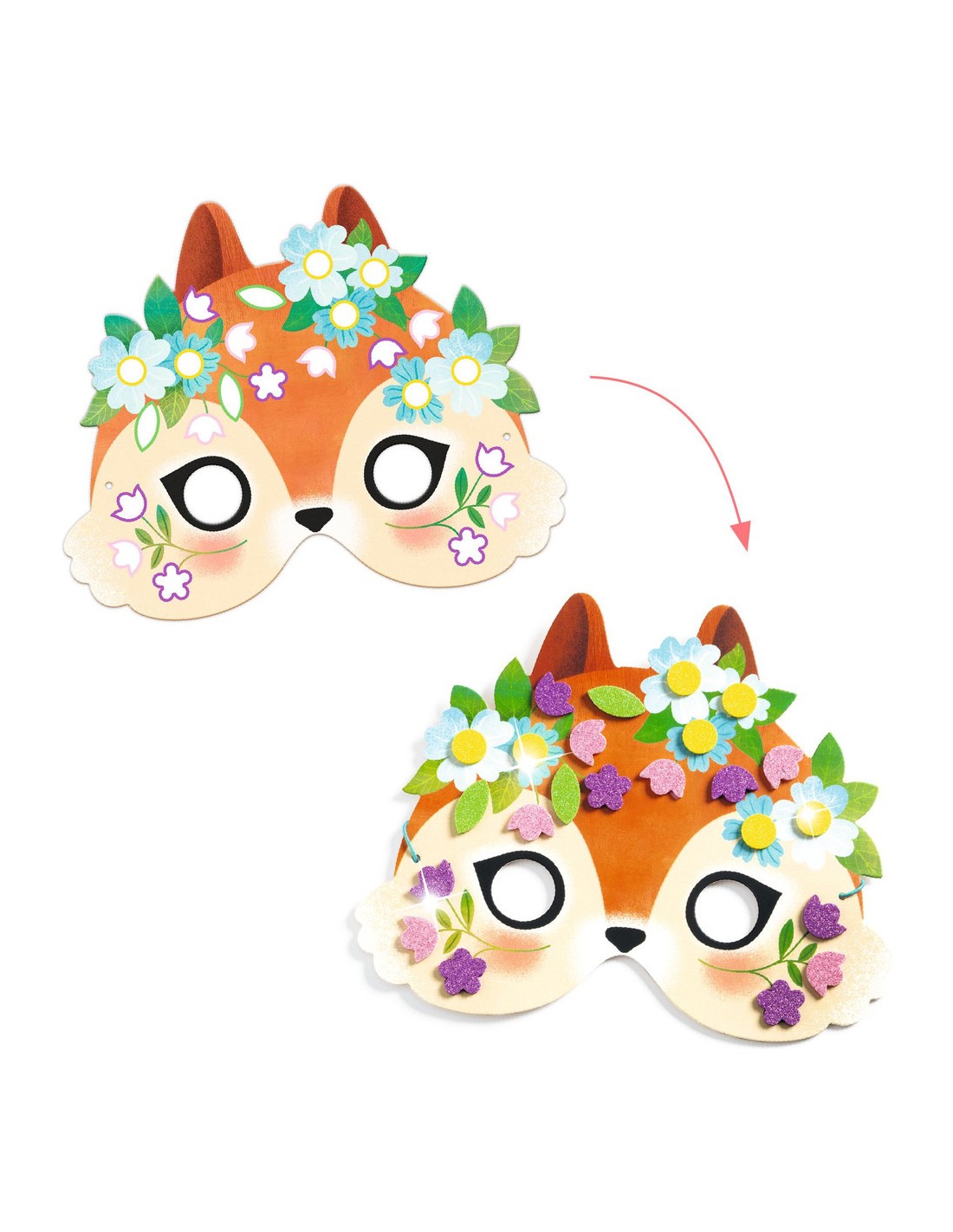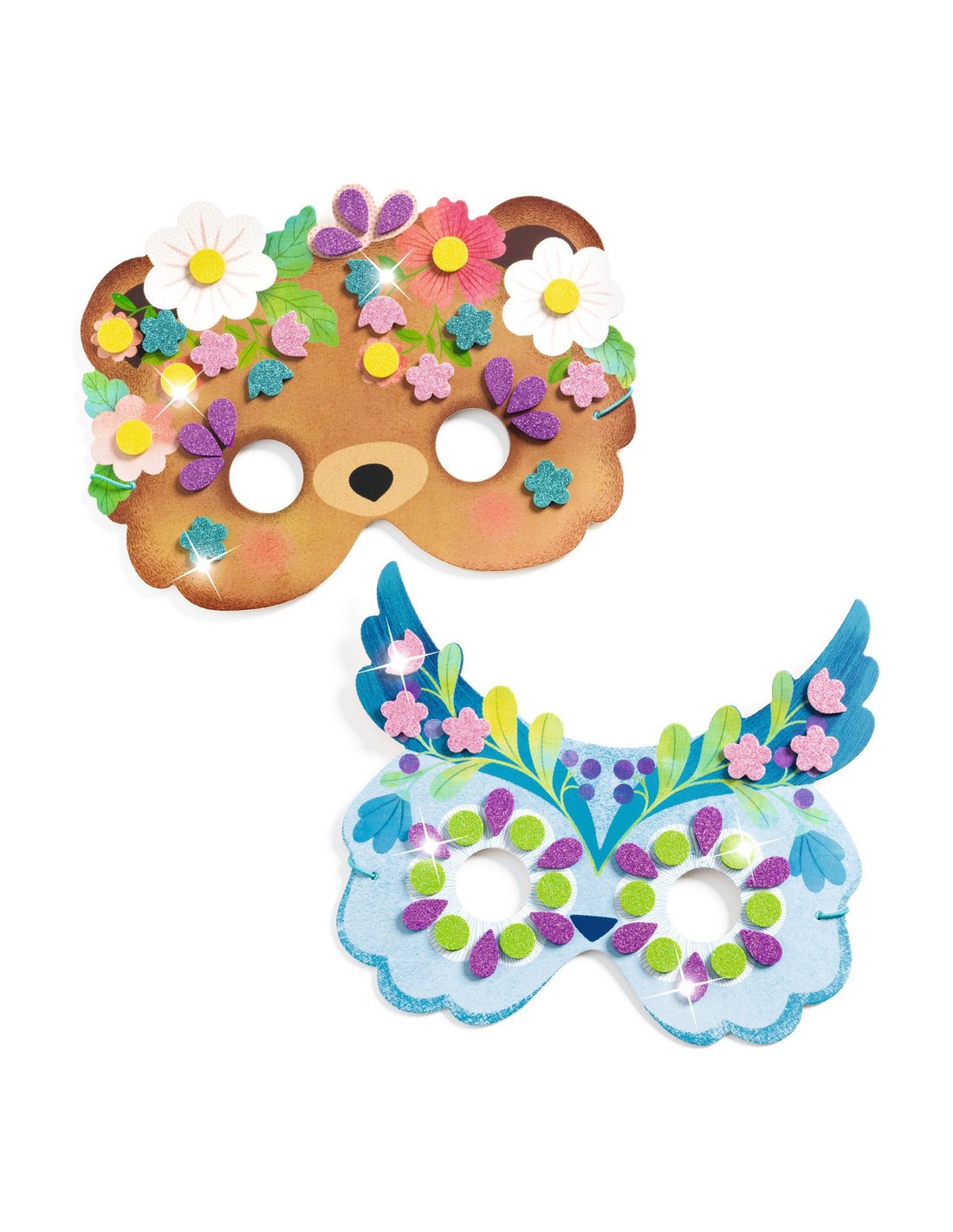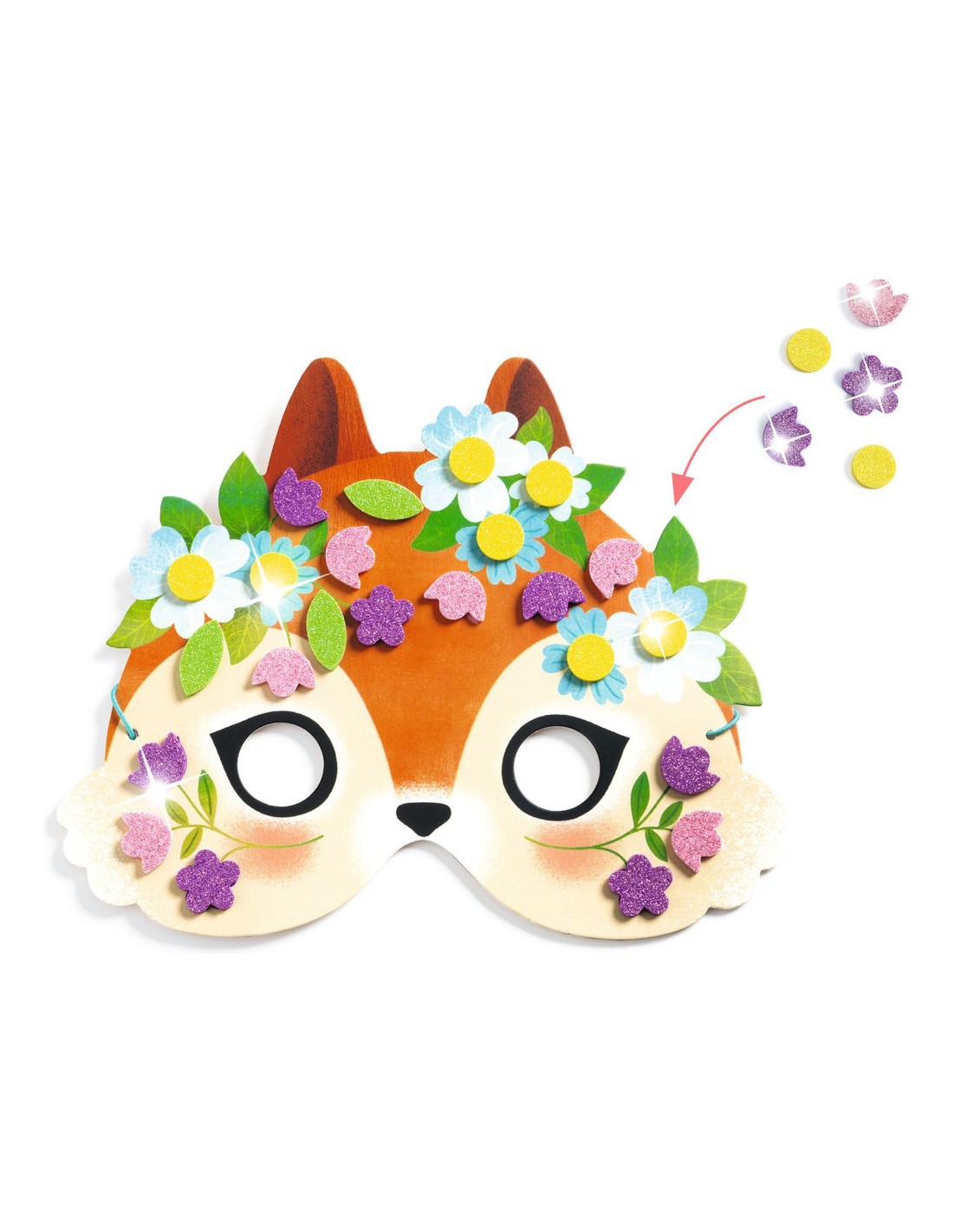 Un kit créatif avec 8 masques sur le thème des animaux de la forêt, à décorer avec des stickers mosaïques pailletés. Les enfants choisissent un masque et y collent les stickers en suivant les indications de couleurs.