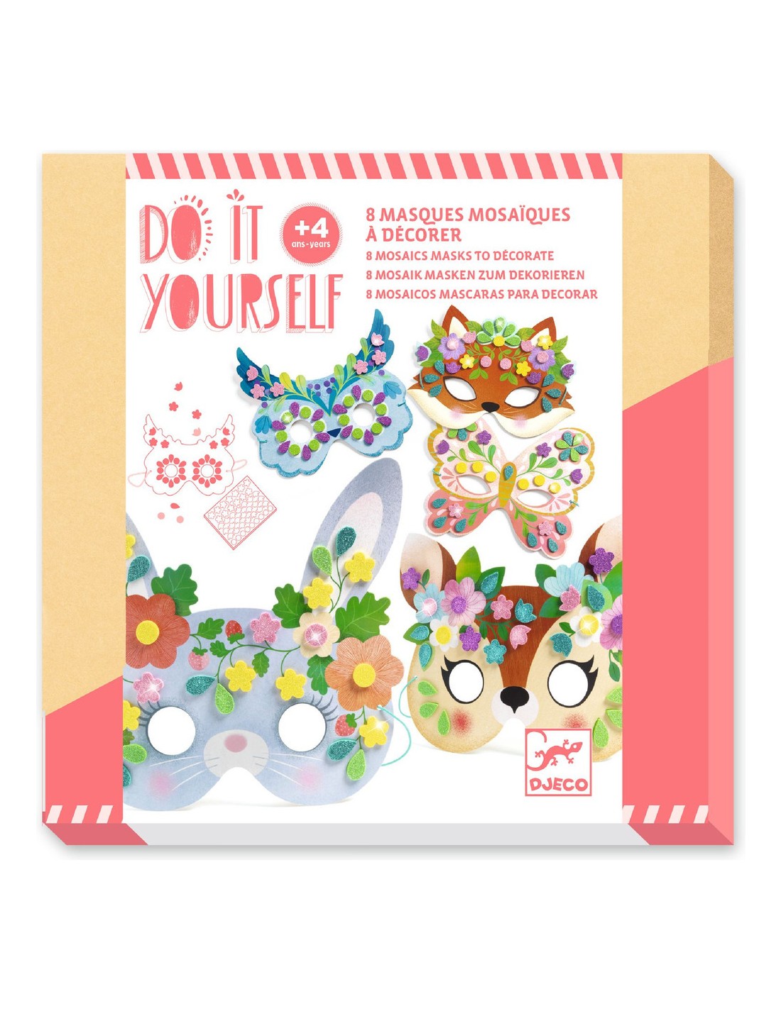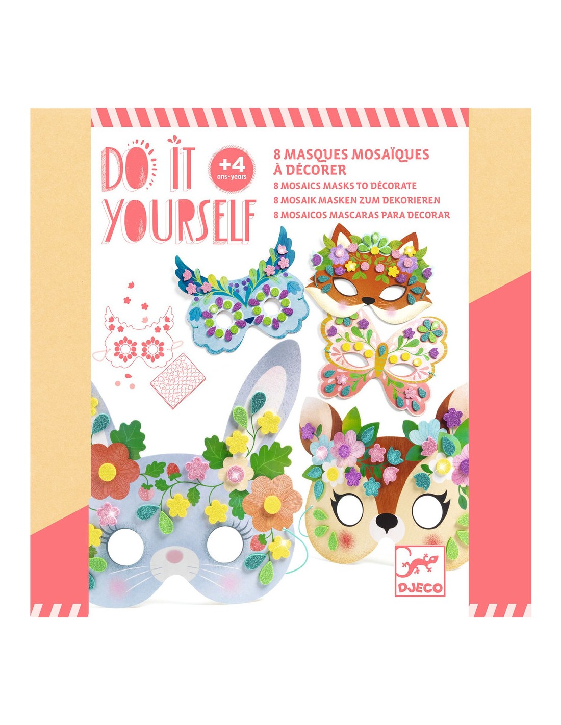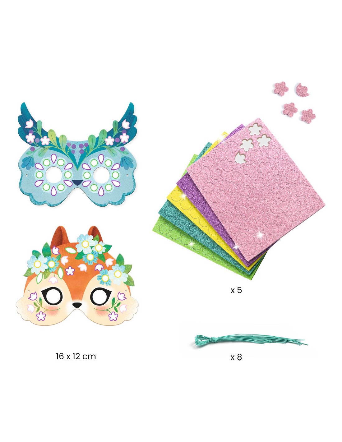 Un kit créatif avec 8 masques sur le thème des animaux de la forêt, à décorer avec des stickers mosaïques pailletés. Les enfants choisissent un masque et y collent les stickers en suivant les indications de couleurs.