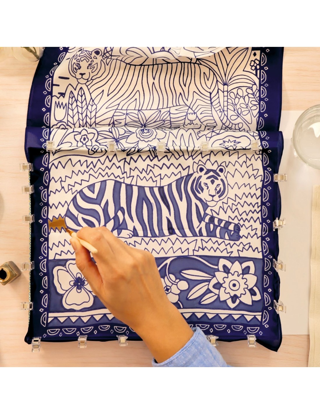 Pas besoin d'être précis : les couleurs se diffusent proprement. Vous réaliserez un long foulard en soie, une création unique à porter fièrement ou à offrir en cadeau. Et pour vous accompagner à chaque étape, un tuto vidéo permettant d'apprendre les bons gestes. À découvrir en toute liberté, chez soi, à son rythme, pour une expérience de détente inédite.