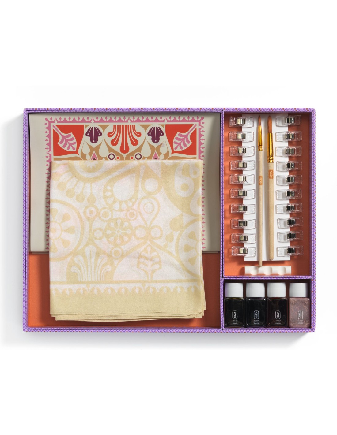 Contenu : 1 foulard en soie (dimension 130 x 34 cm ) prêt à peindre, avec la "gutta" déjà posée pour délimiter les motifs. 20 pinces à tissu 4 bouteilles x 30 ml de peinture sur soie 2 pinceaux 1 support pour pinceau 1 modèle à suivre Un dépliant et une carte avec QR code menant à une vidéo tuto pour découvrir l’activité