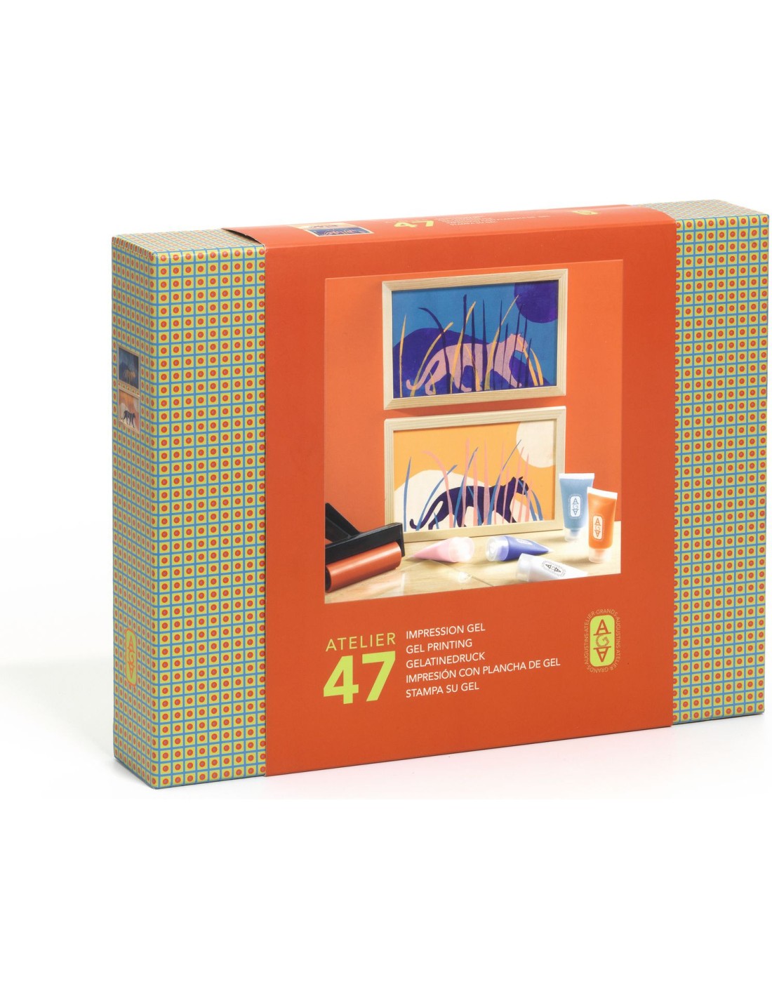 Contenu : 1 plaque de gel en silicone (format 235 x 150 mm) Un rouleau brayer 5 tubes de peinture 30 ml 10 papiers à imprimer 4 pochoirs indéchirables 2 cadres en bois Un dépliant et une carte avec QR code menant à une vidéo tuto pour découvrir l’activité