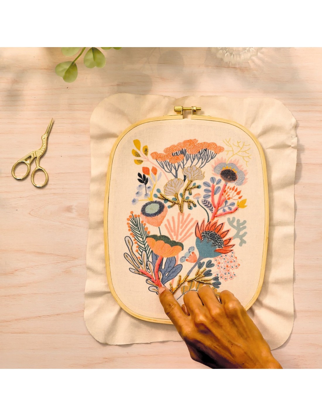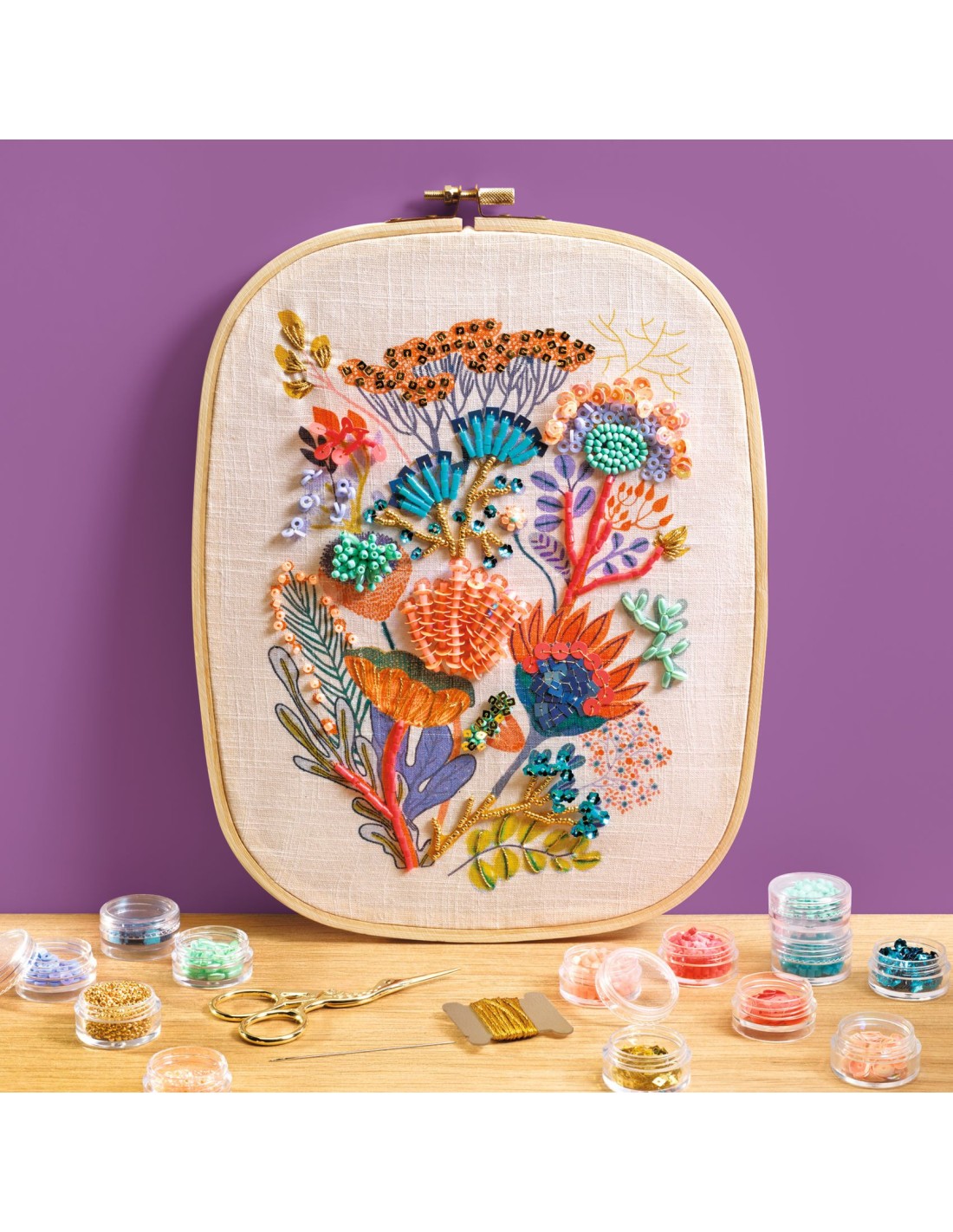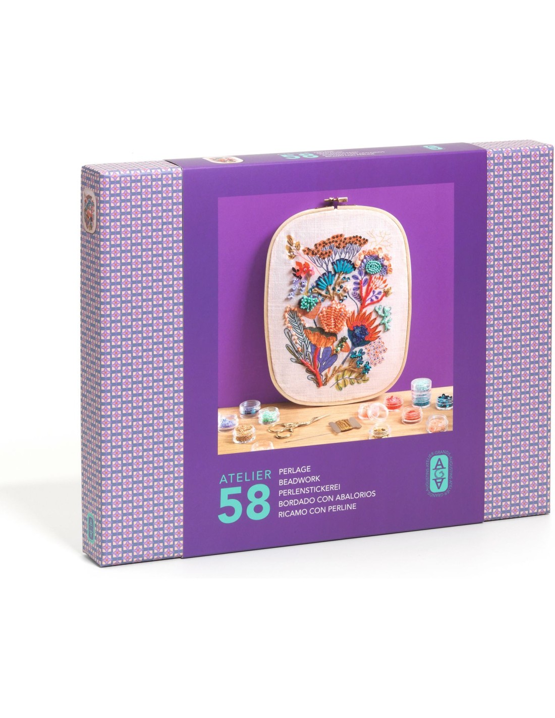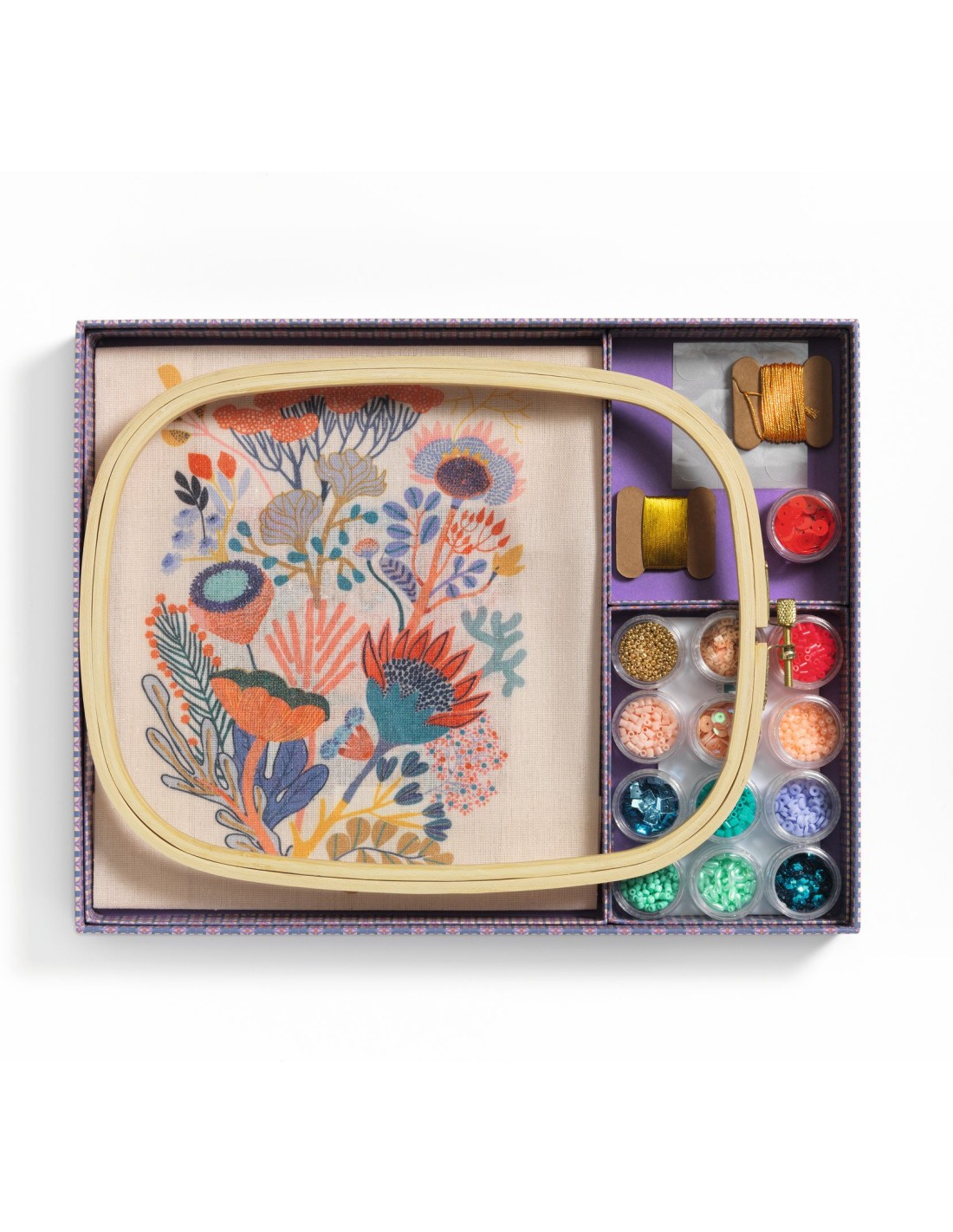 Contenu : 1 tambour de broderie en bois 1 toile imprimée 1 paire de ciseaux de broderie 13 boîtes de perles et sequins 1 tapis d'enfilage 23 aiguilles 1 passe-fil 2 bobines de fil doré 1 modèle à suivre Un dépliant et une carte avec QR code menant à une vidéo tuto pour découvrir l’activité