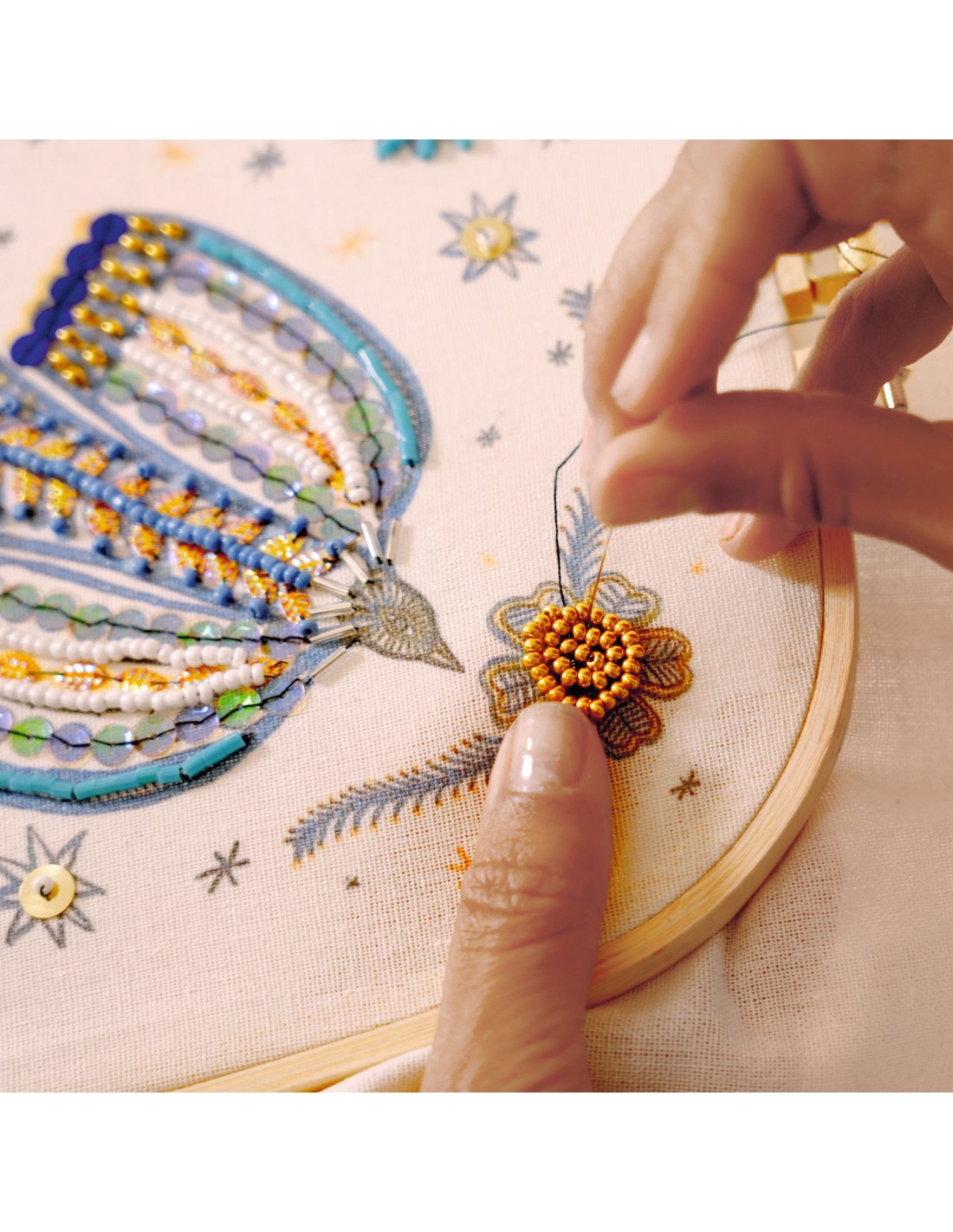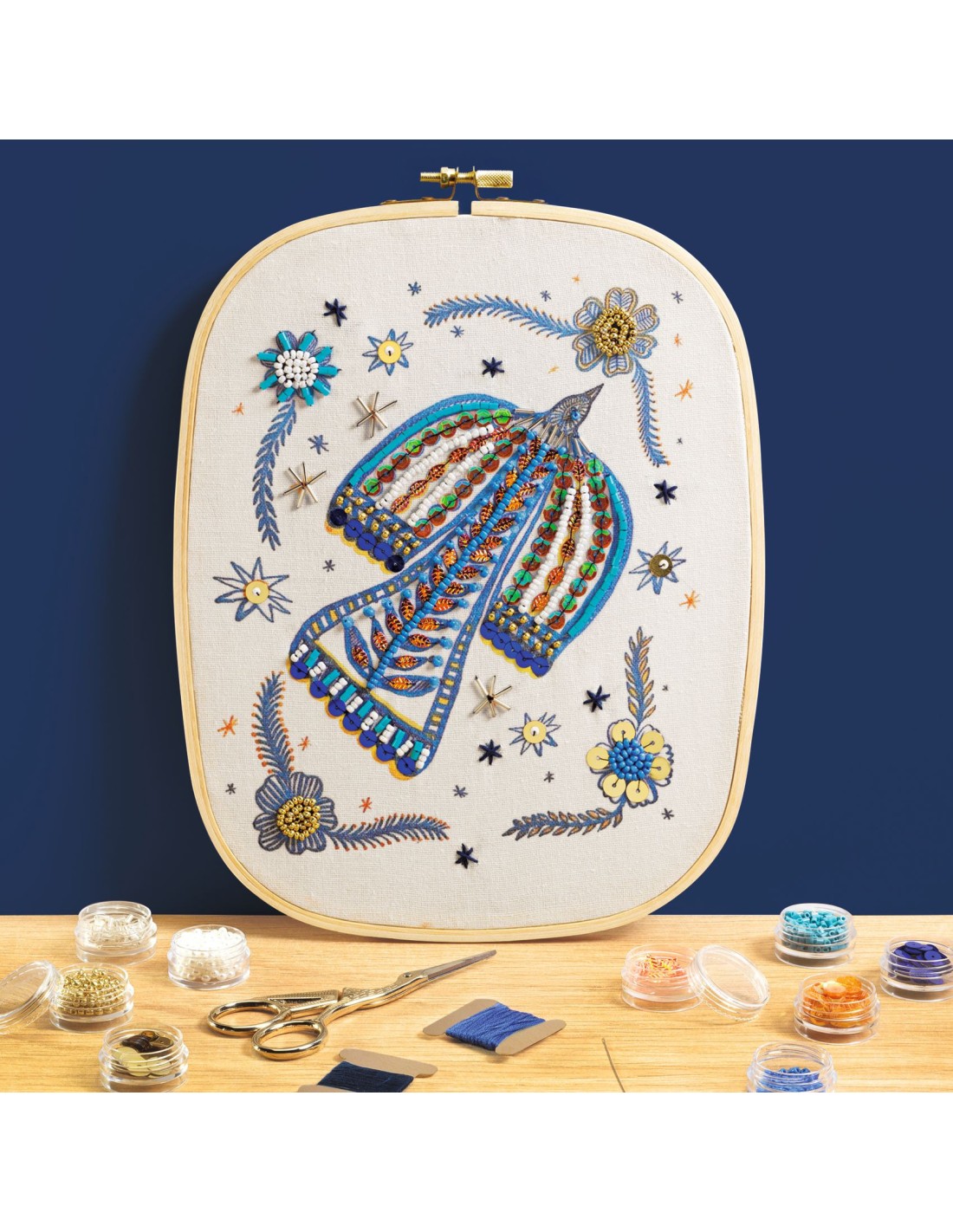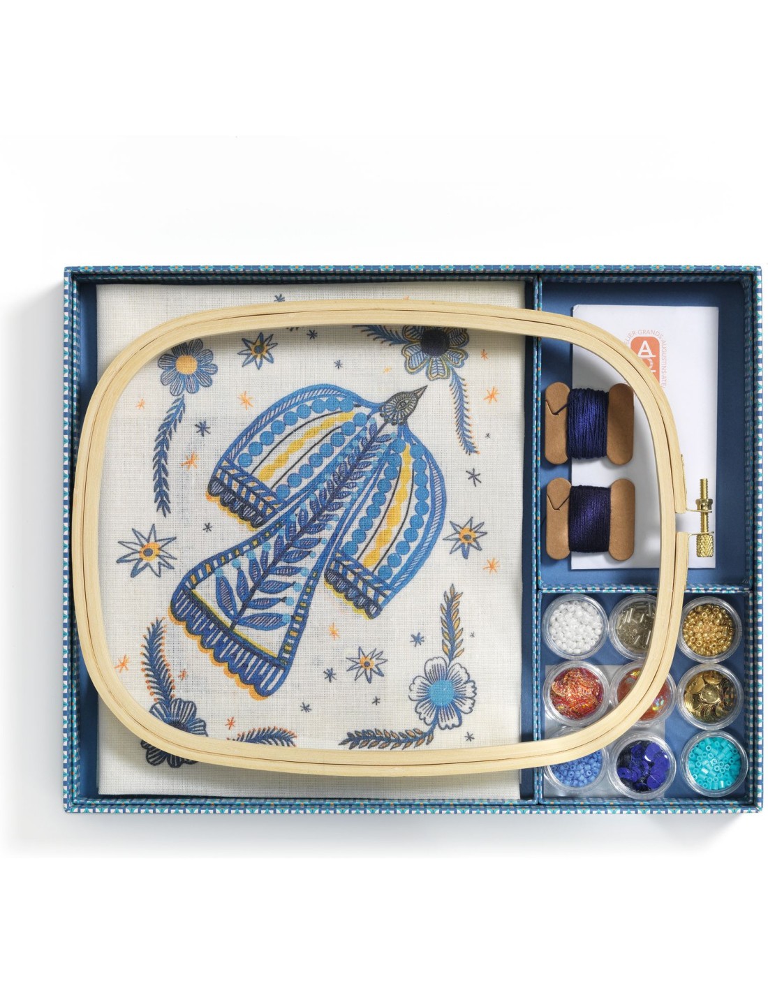 Contenu : 1 tambour de broderie en bois 1 toile imprimée 1 paire de ciseaux de broderie 9 boîtes de perles et sequins 1 tapis d'enfilage 2 aiguilles 1 passe-fil 2 bobines de fil bleu 1 modèle à suivre Un dépliant et une carte avec QR code menant à une vidéo tuto pour découvrir l’activité