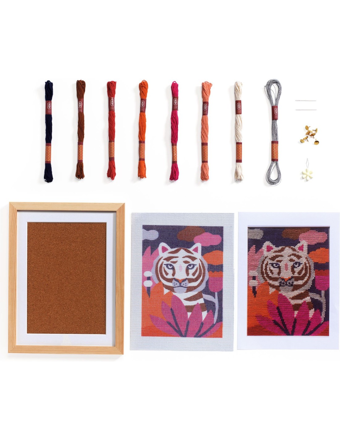 Contenu : 1 toile à canevas imprimée en couleurs 8 x 15 mètres de fils de couleurs 2 aiguilles 1 passe-fil 1 paire de ciseaux de broderie 8 punaises 1 cadre en bois 1 modèle à suivre Un dépliant et une carte avec QR code menant à une vidéo tuto pour découvrir l’activité