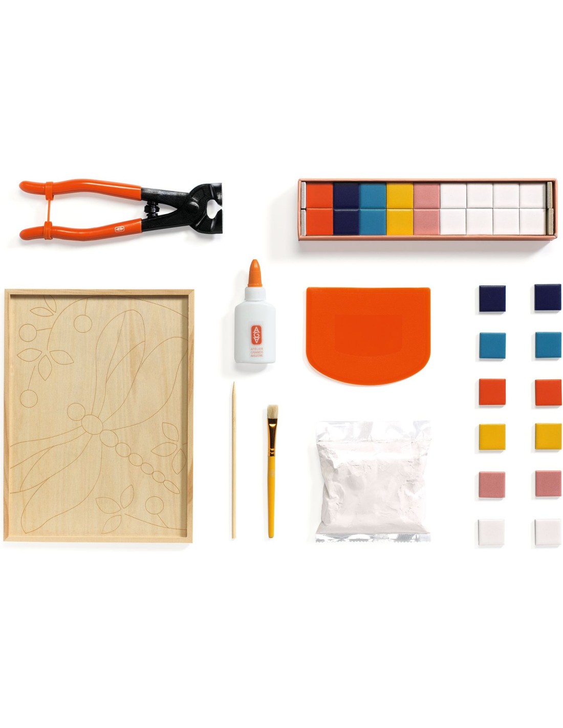 Contenu : 1 plaque de bois imprimée 100 tesselles en céramique 1 pince de mosaïste à couper les tesselles 1 sachet de ciment 1 spatule souple 1 tube de colle 1 modèle à suivre Un dépliant et une carte avec QR code menant à une vidéo tuto pour découvrir l’activité