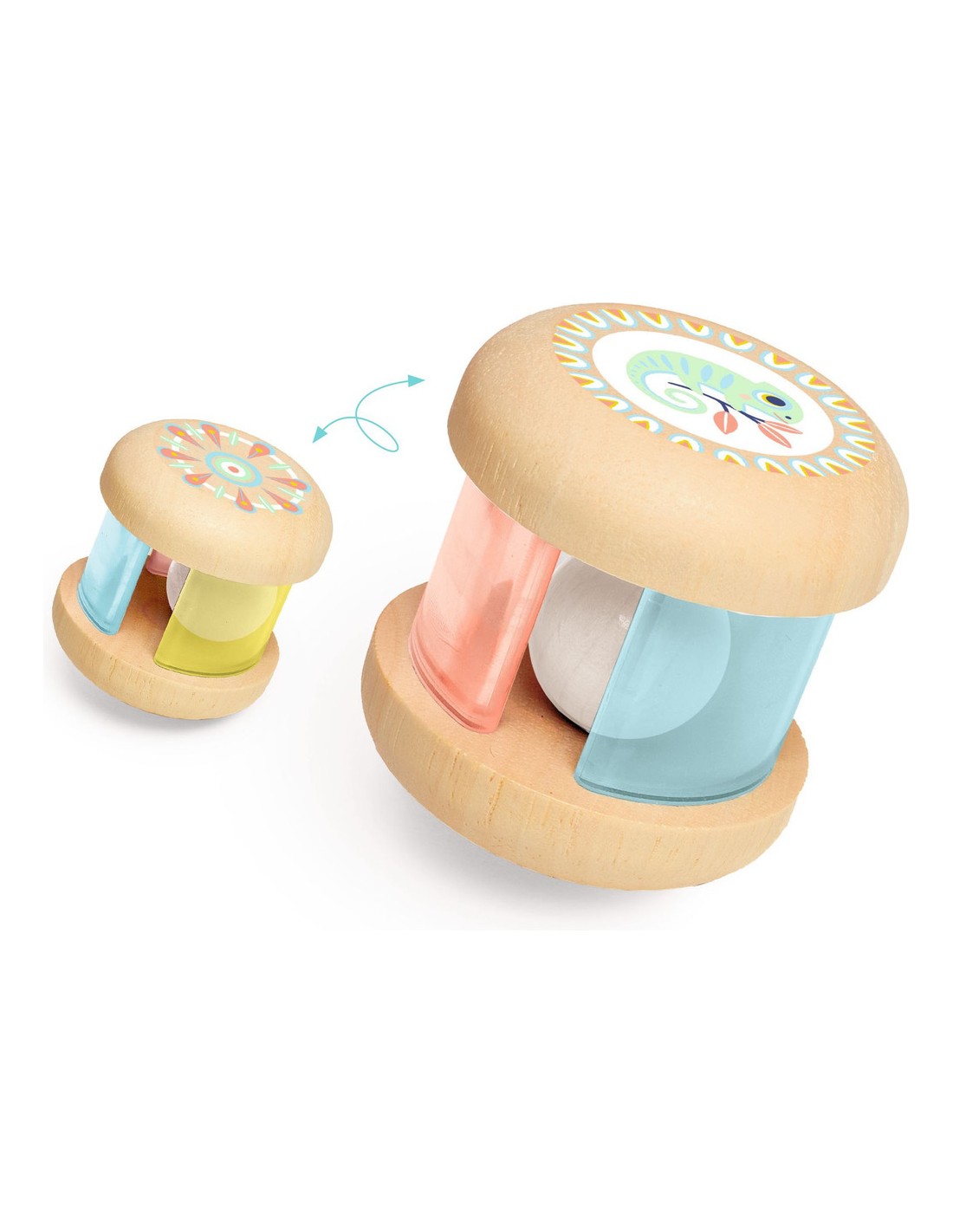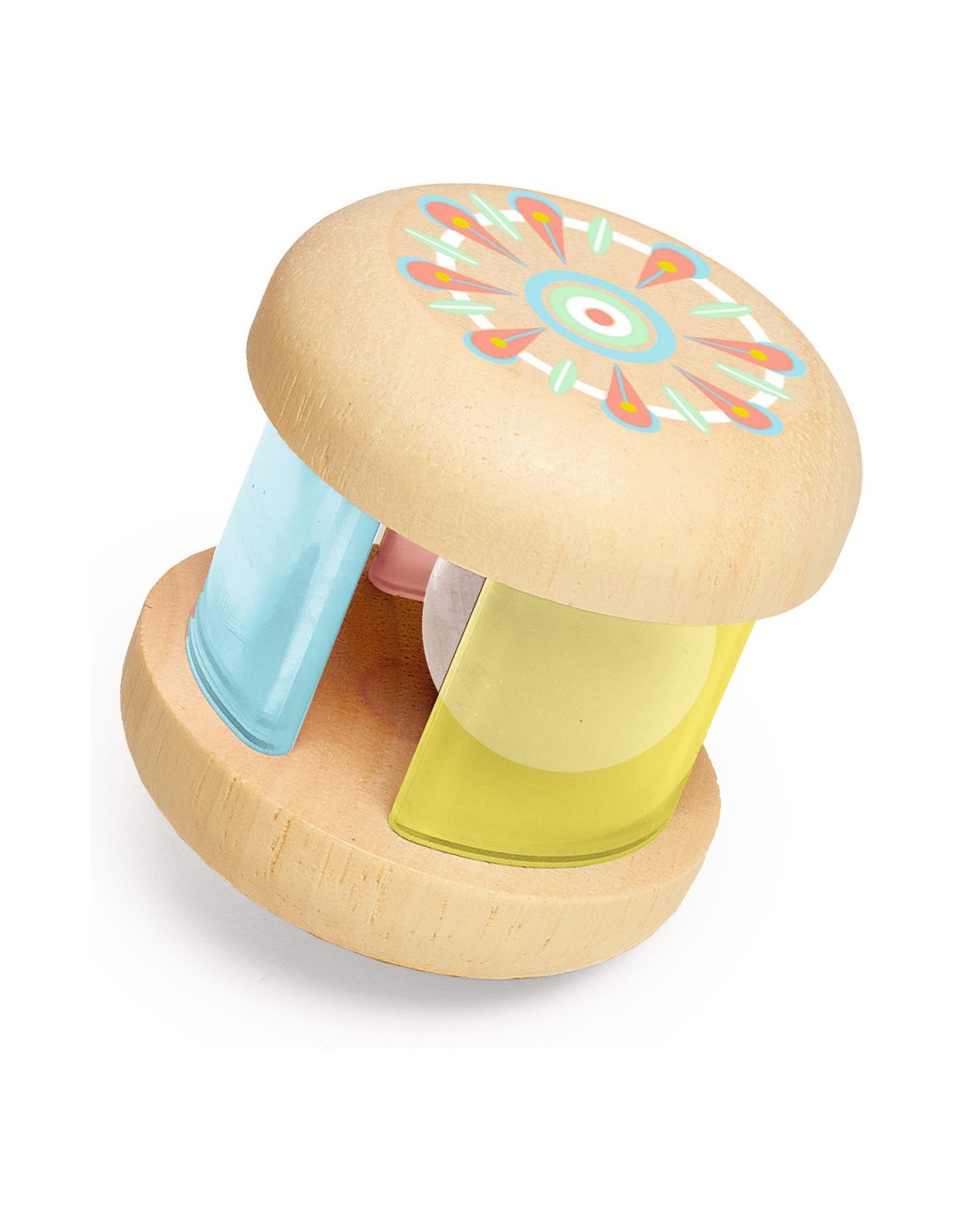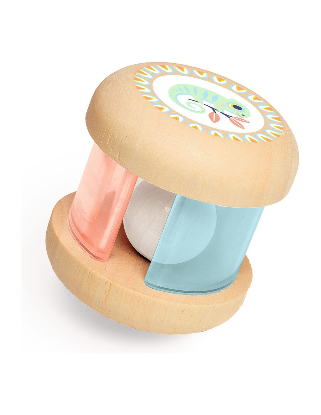 Un hochet en bois naturel illustré aux couleurs pastel, destiné aux bébés dès 3 mois. Une grosse boule en bois qui glisse devant des plaques translucides colorées, pour un effet visuel et sonore fascinant.