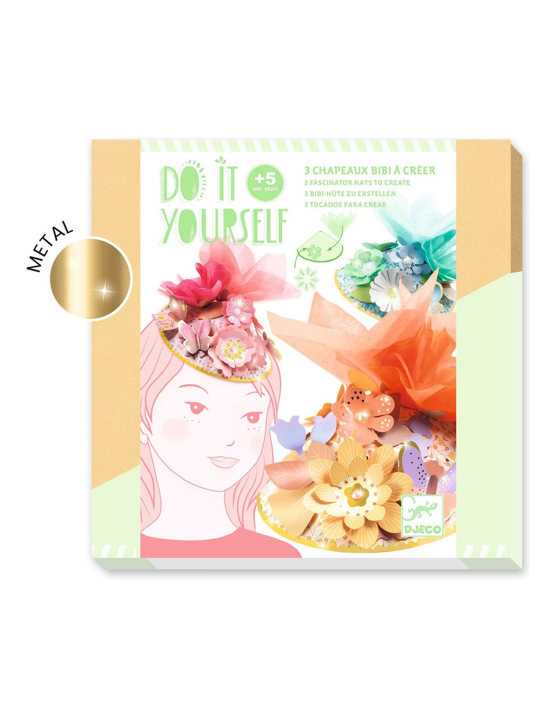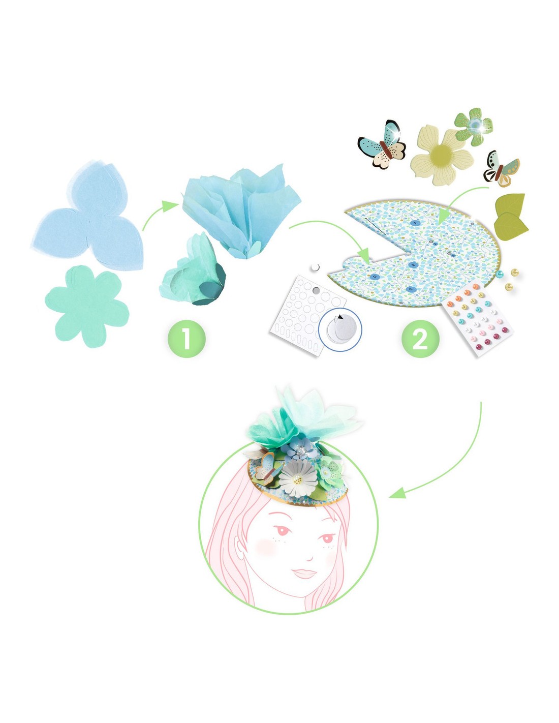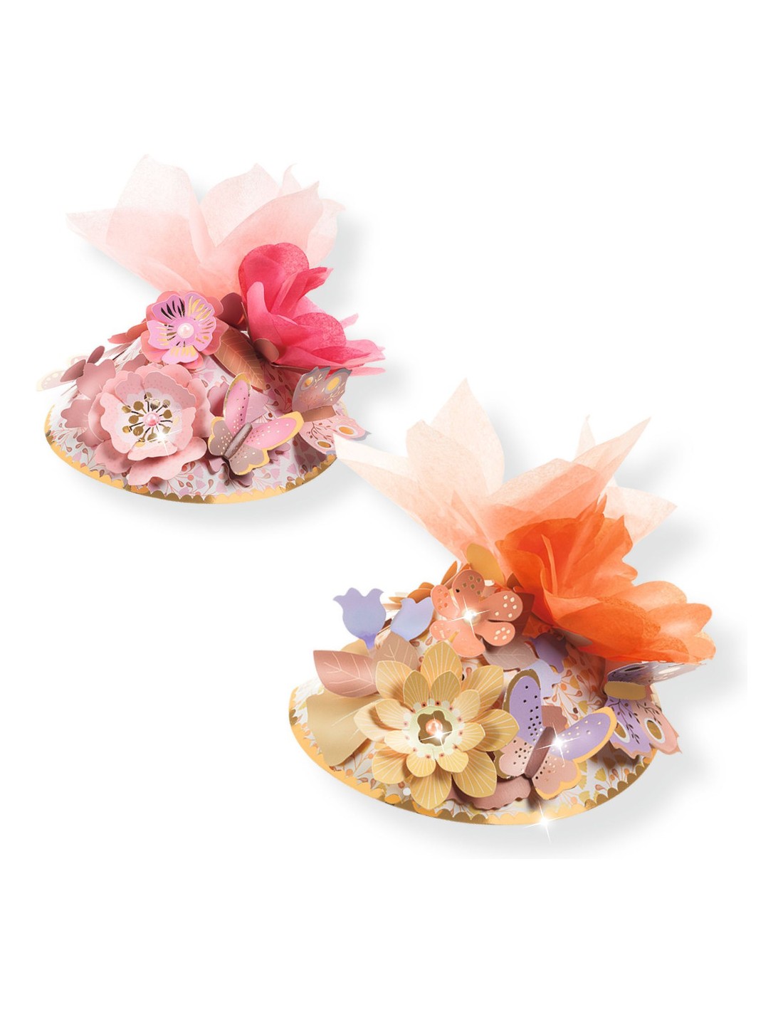 Contenu : 3 chapeaux avec un motif floral différent, 3 jeux de 2 fleurs en papier de soie assorties à assembler avec leurs 6 attaches parisiennes, 3 assortiments de décorations florales en papier à coller, 3 planches de mousses adhésives double-face, 1 planche de fausses perles adhésives, 3 élastiques ronds dorés, 1 notice explicative détaillée pour chaque chapeau.