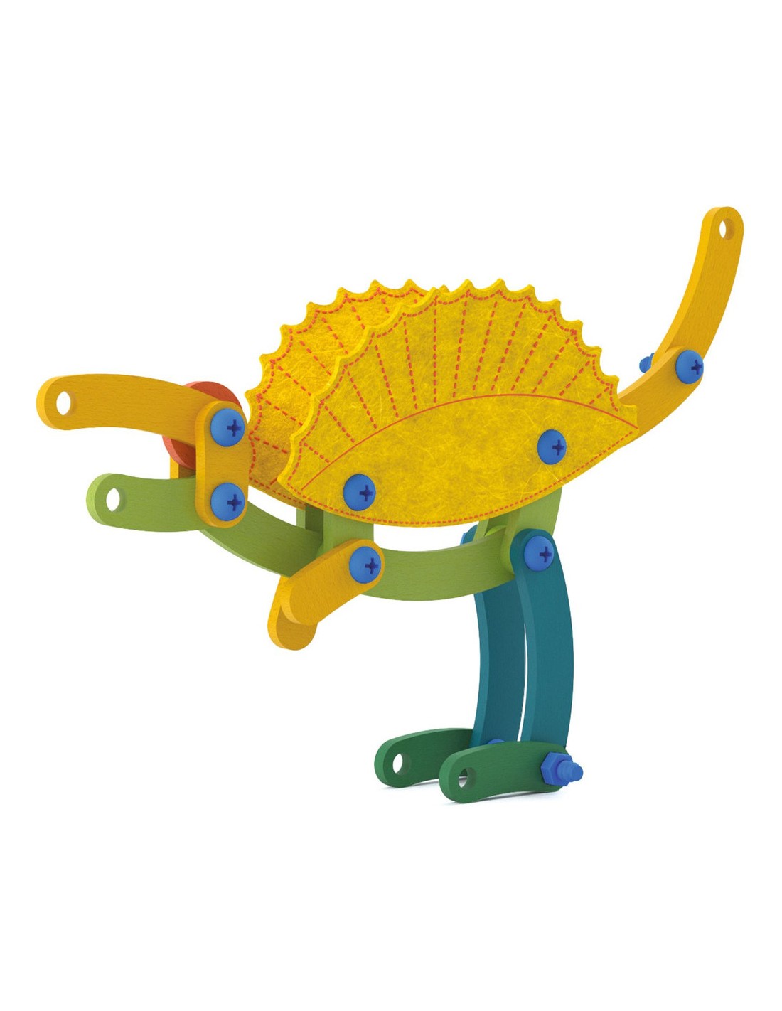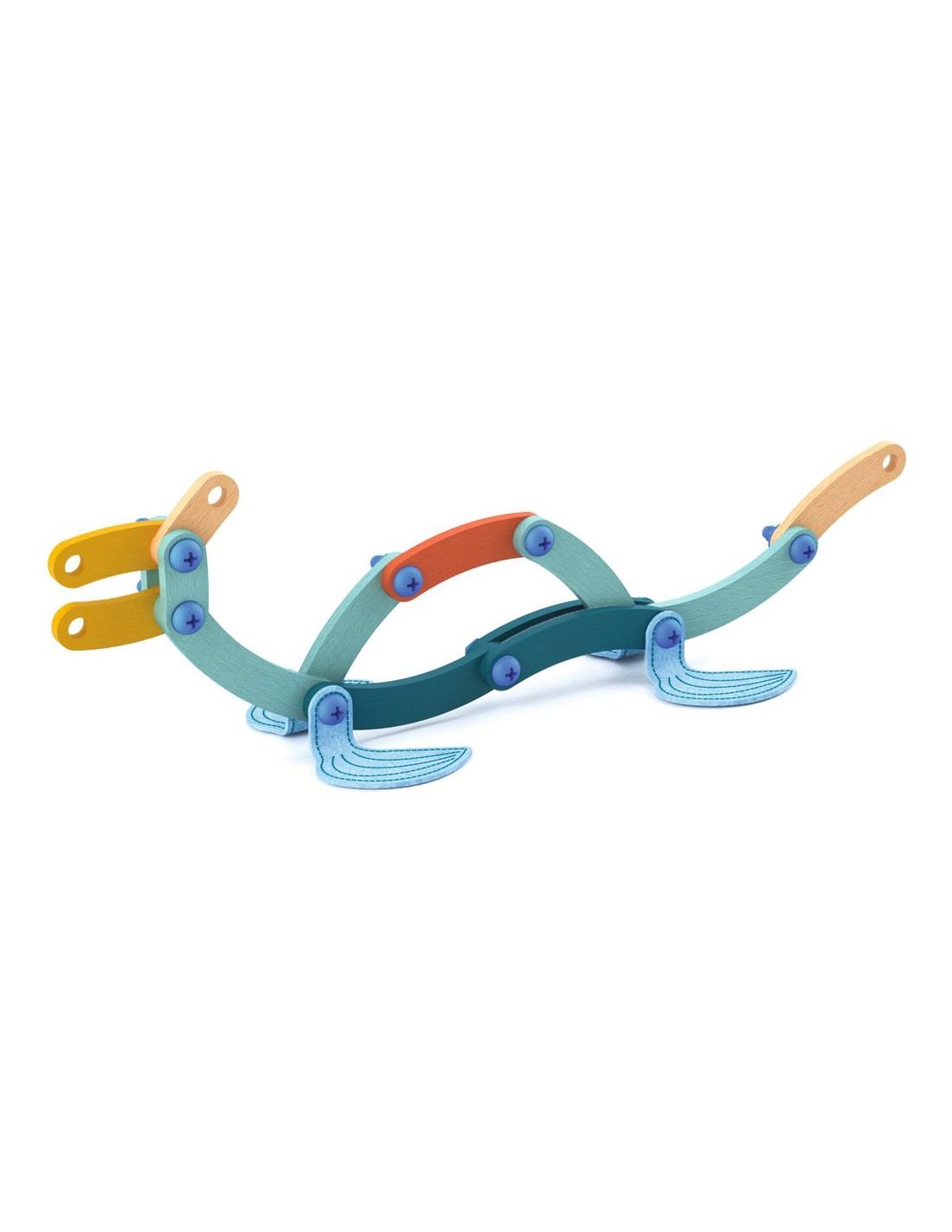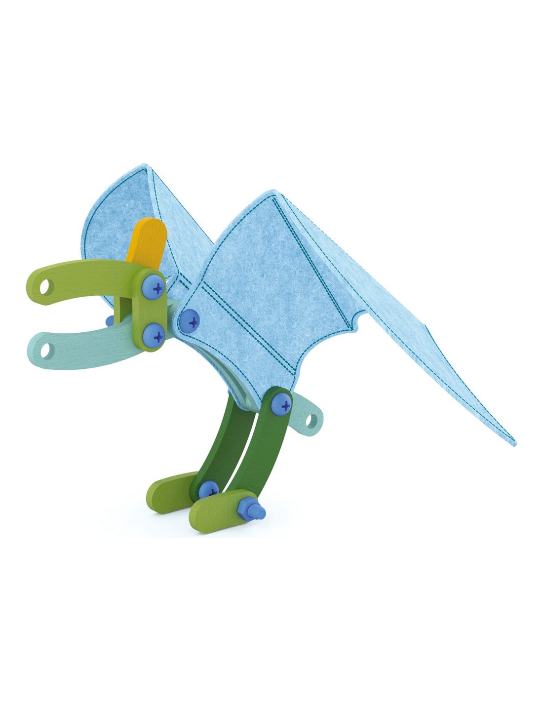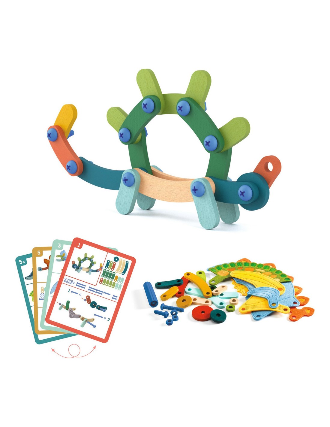Contenu : 88 pièces de bois de différentes couleurs et de 8 formes différentes, 41 vis et boulons, 1 outil de vissage/dévissage, 13 pièces de feutrine brodée et 10 cartes-modèles.