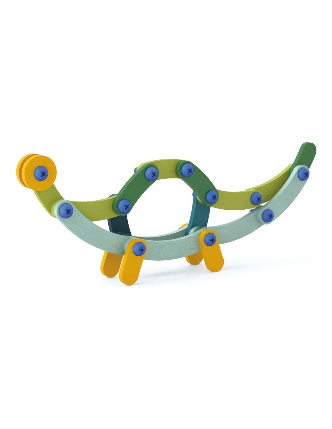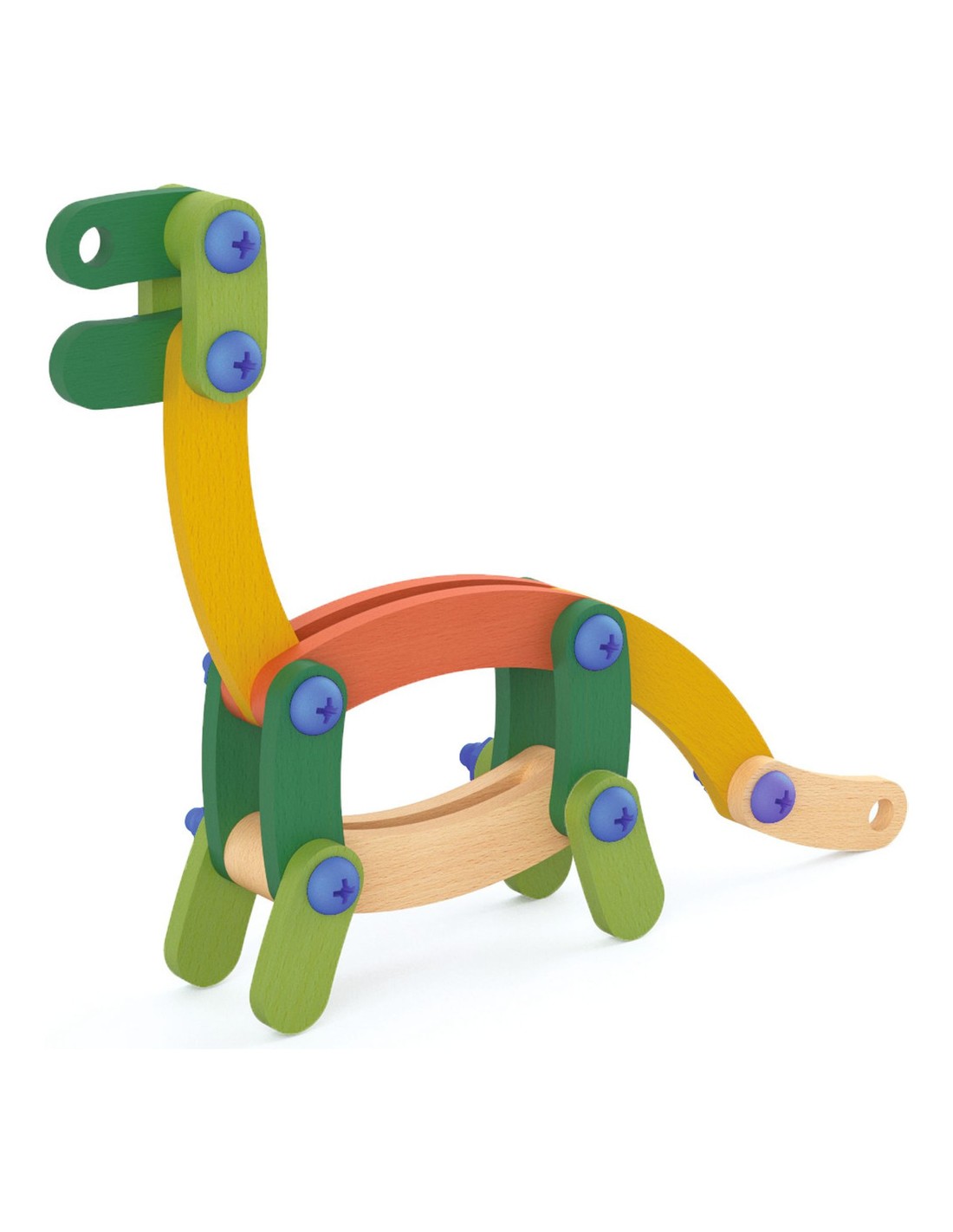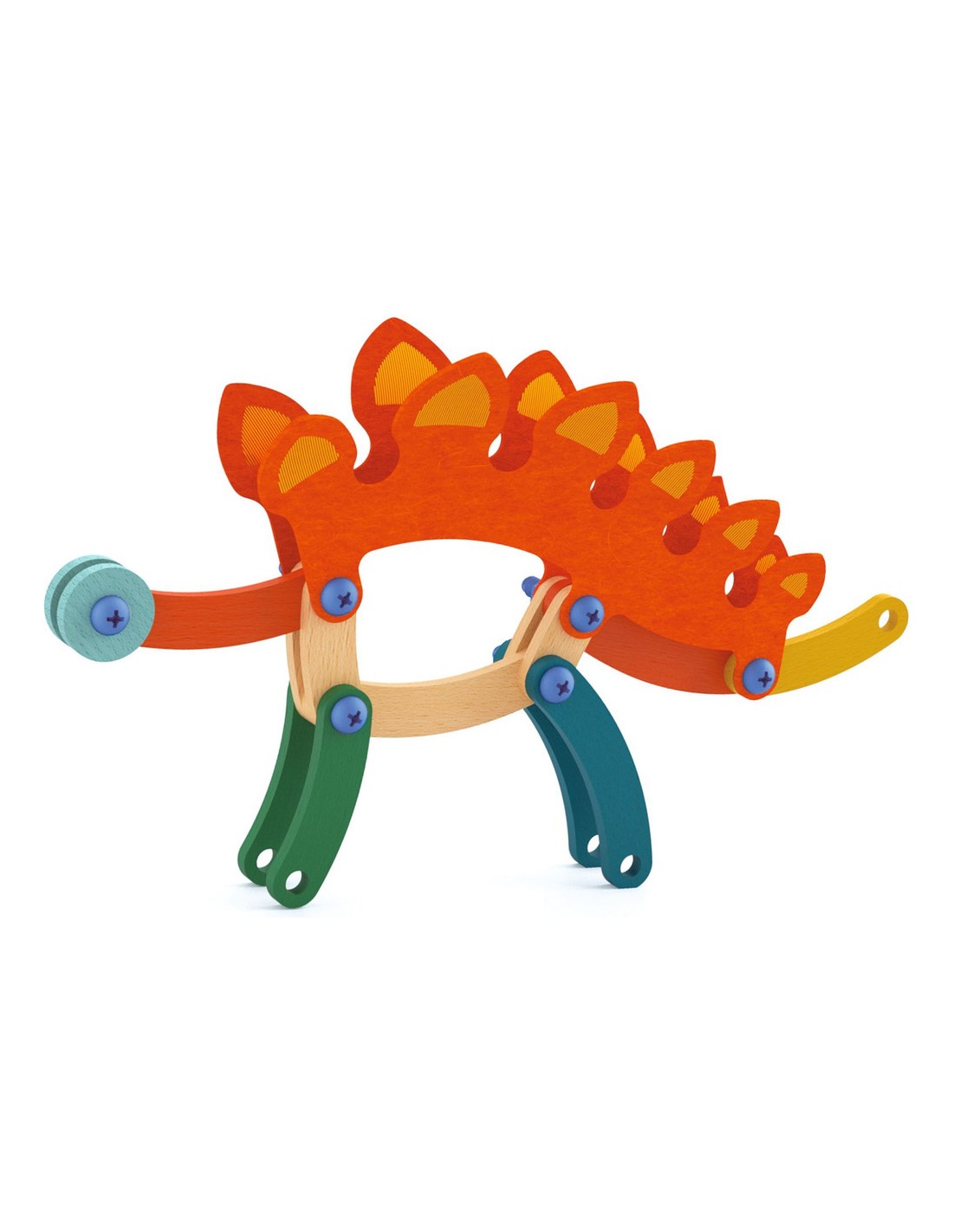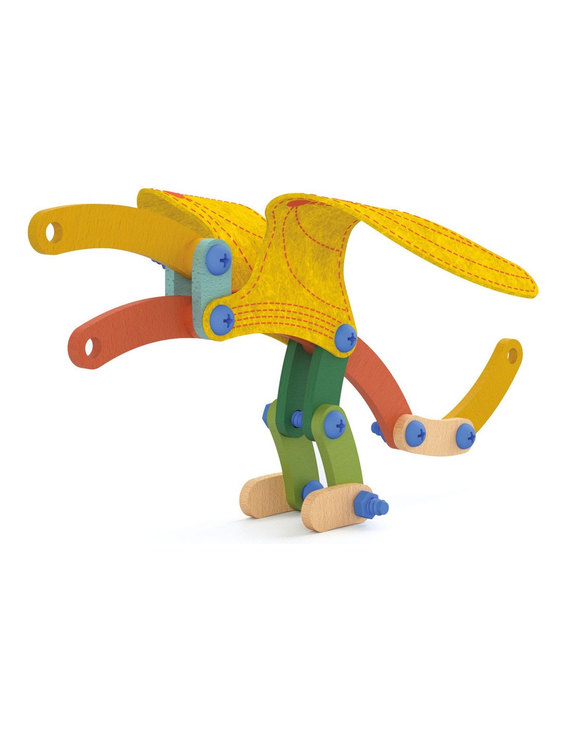 Contenu : 88 pièces de bois de différentes couleurs et de 8 formes différentes, 41 vis et boulons, 1 outil de vissage/dévissage, 13 pièces de feutrine brodée et 10 cartes-modèles.