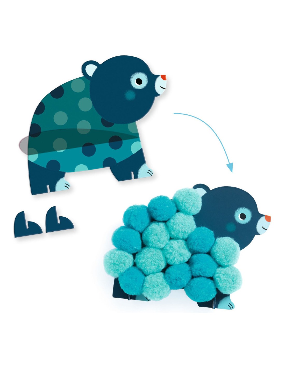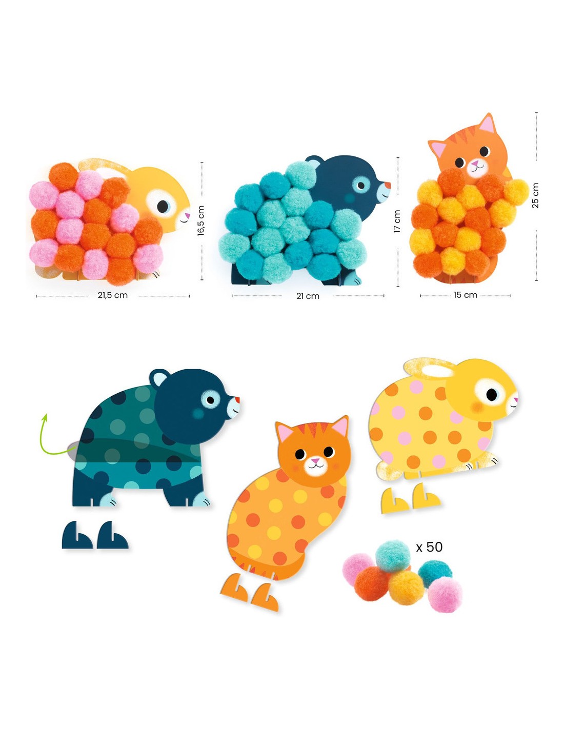 Une activité de collage pour compléter les 3 animaux avec de gros pompons. En suivant les modèles du livret explicatif, l'enfant colle les gros pompons colorés sur les parties autocollantes des 3 animaux. Surprise, 3 animaux tout doux à caresser apparaissent !