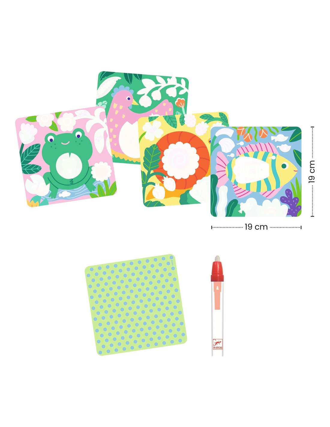 Contenu : 4 planches illustrées carrées en plastique souple avec une couche blanche qui disparaît, un crayon à reservoir d'eau et 1 support en carton épais.