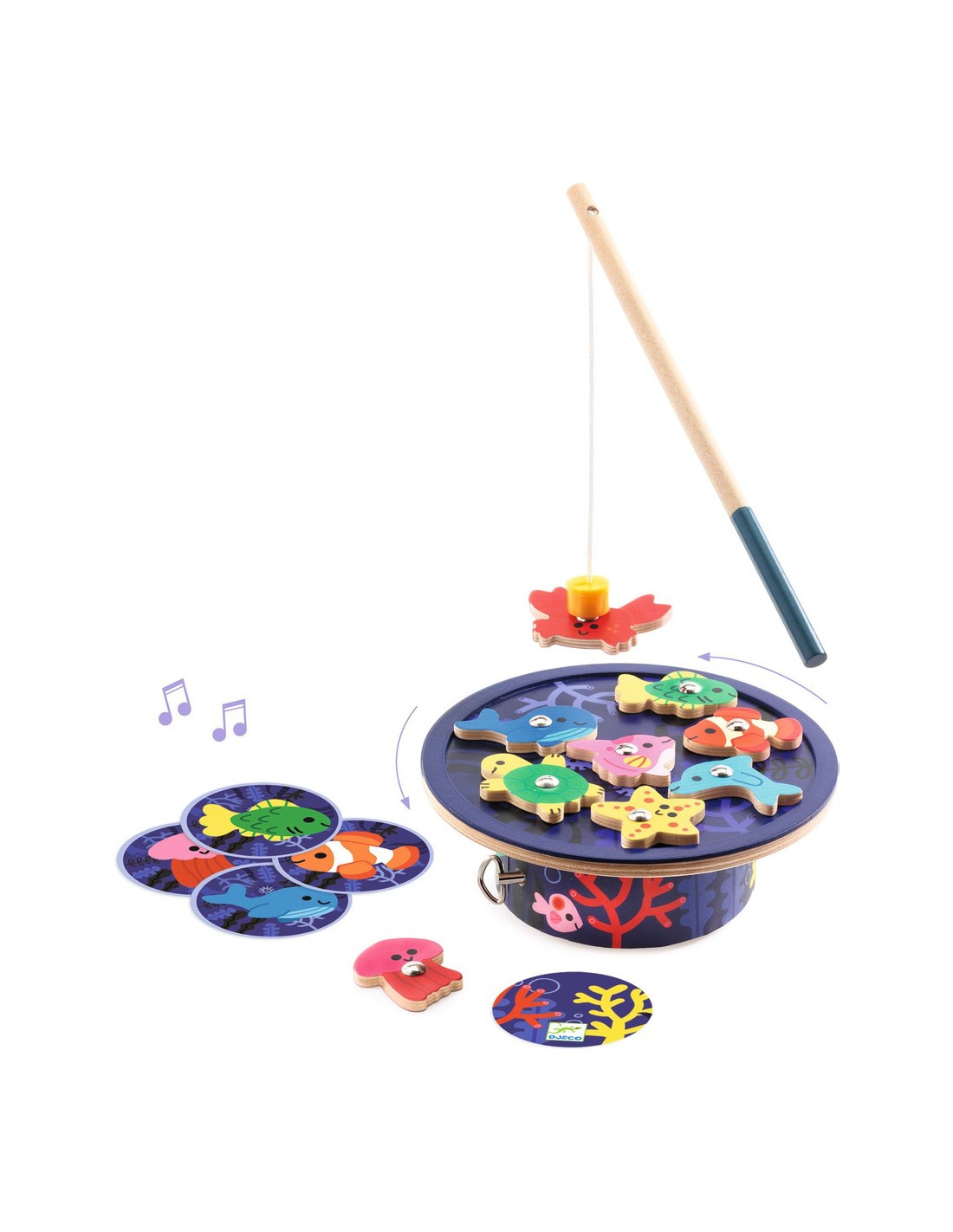 Contenu : 1 plateau en bois servant aussi de boîte à musique, 9 cartes défi, 1 canne à pêche en bois et 9 poissons en bois.