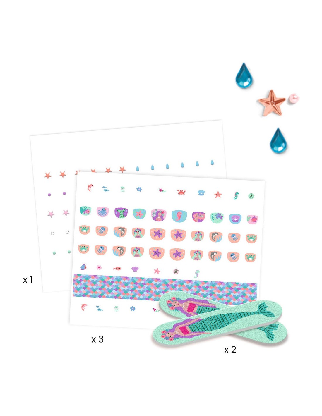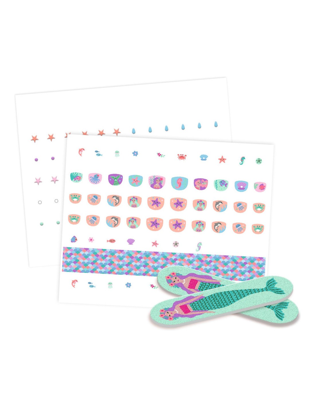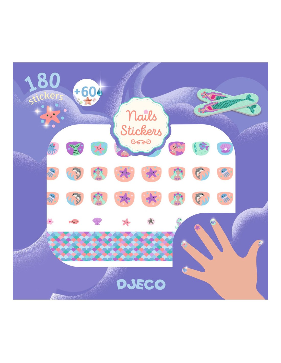 Contenu : 90 nails stickers + 90 gommettes + 3 bandes de motifs à découper + 2 limes à ongles. 60 perles et strass autocollants