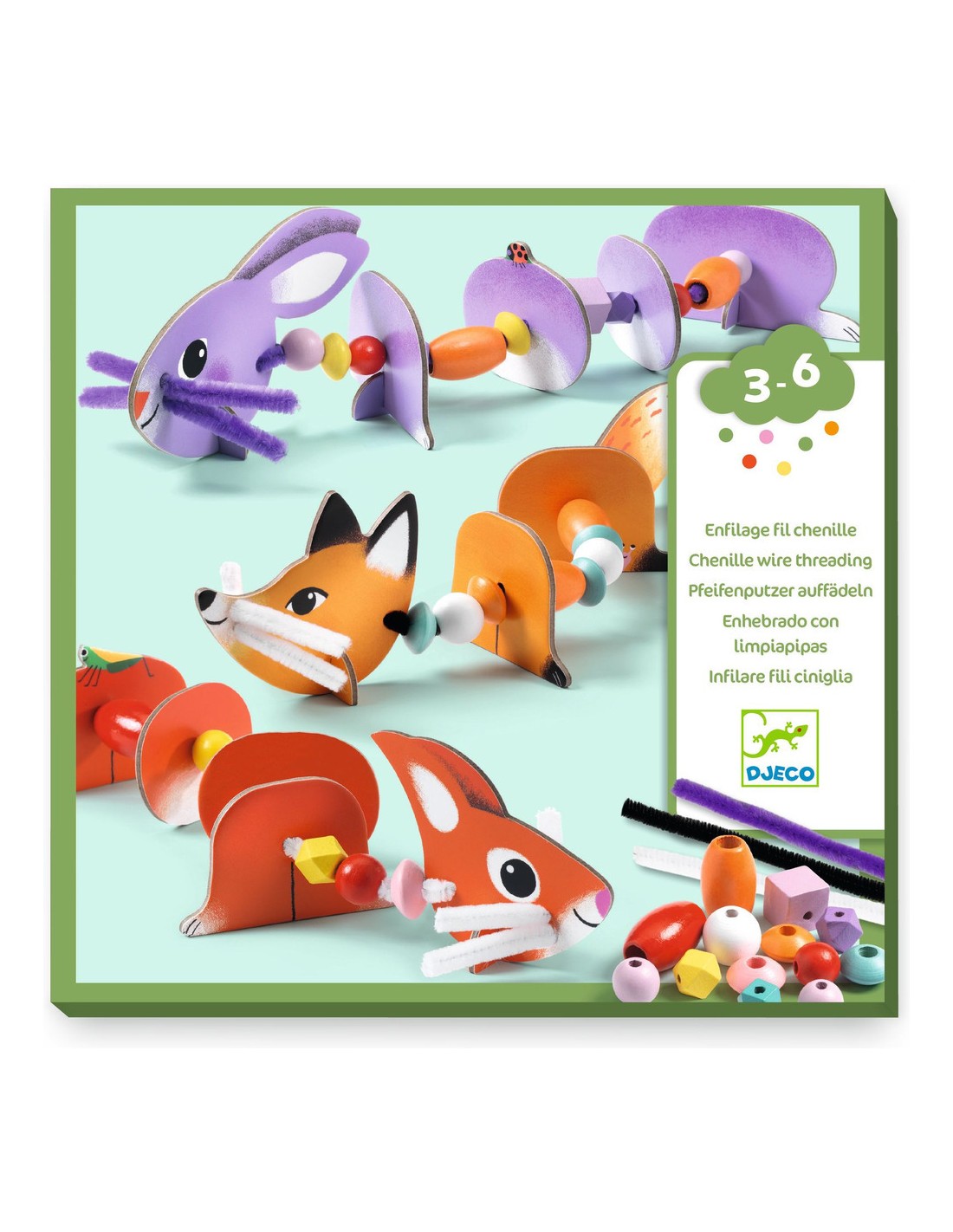- Une multitude d’éléments à manipuler : fil chenille, perles de bois et cartons prédécoupés.
