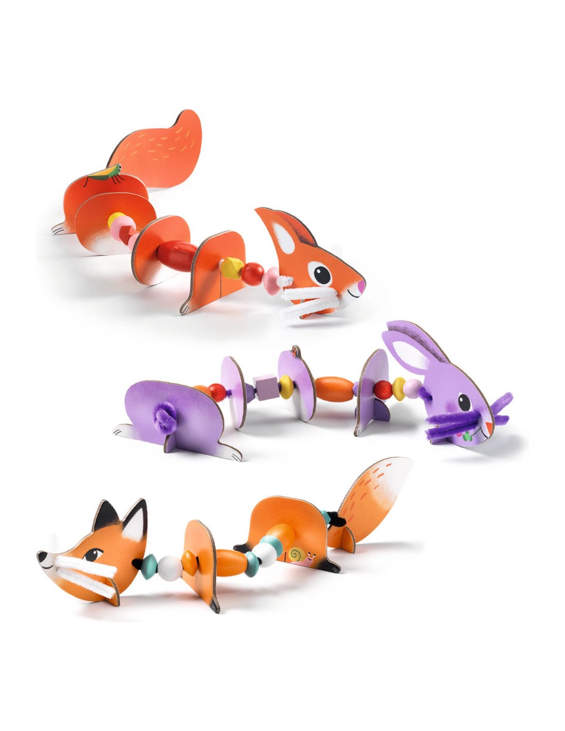 Une activité originale pour donner vie à 3 adorables animaux ! Sur le fil chenille, l’enfant enfile perles de bois et éléments prédécoupés en carton épais pour créer ses modèles. Une activité qui stimule la créativité, la motricité fine et l’imagination, avec des possibilités infinies de combiner les éléments et d'inventer ses propres animaux rigolos.
