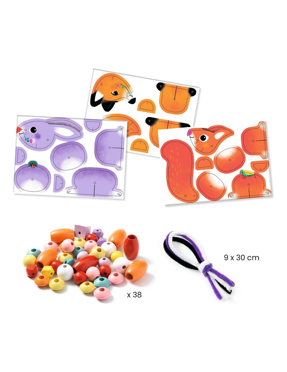 Contenu : 3 planches cartonnées avec des éléments à dépuncher, 6 fils chenilles, 39 perles de bois et 1 livret explicatif visuel.