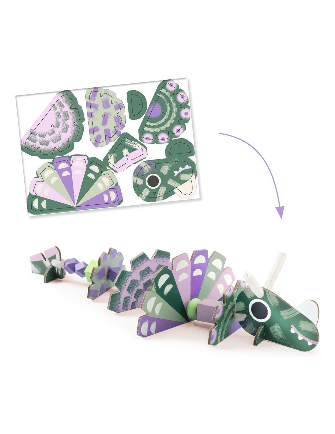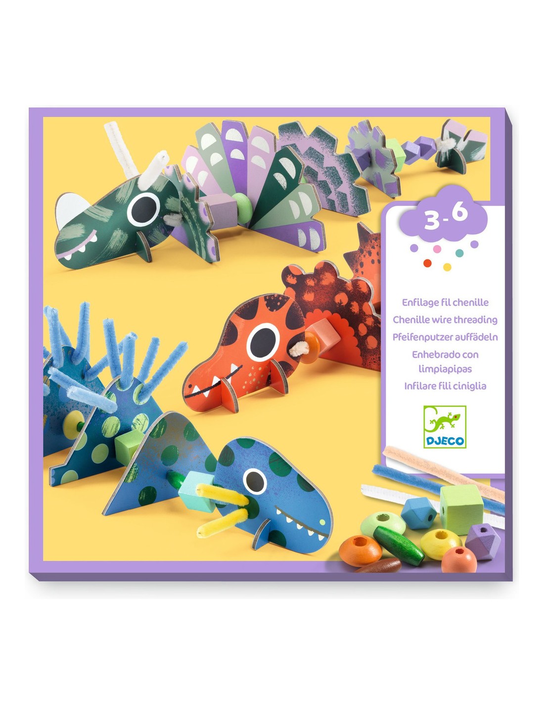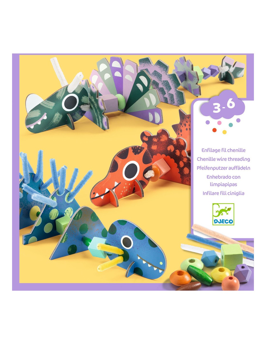 Une activité originale pour donner vie à 3 dinosaures à la fois gentils et terribles ! Sur le fil chenille, l’enfant enfile perles de bois et éléments prédécoupés en carton épais pour créer ses modèles. Une activité qui stimule la créativité, la motricité fine et l’imagination, avec des possibilités infinies de combiner les éléments et d'inventer ses propres dinosaures.