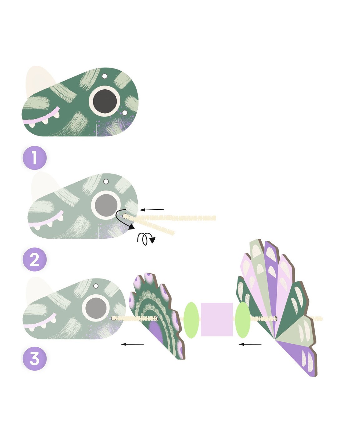 Contenu : 3 planches cartonnées avec des éléments à dépuncher, 6 fils chenilles, 39 perles de bois et 1 livret explicatif visuel