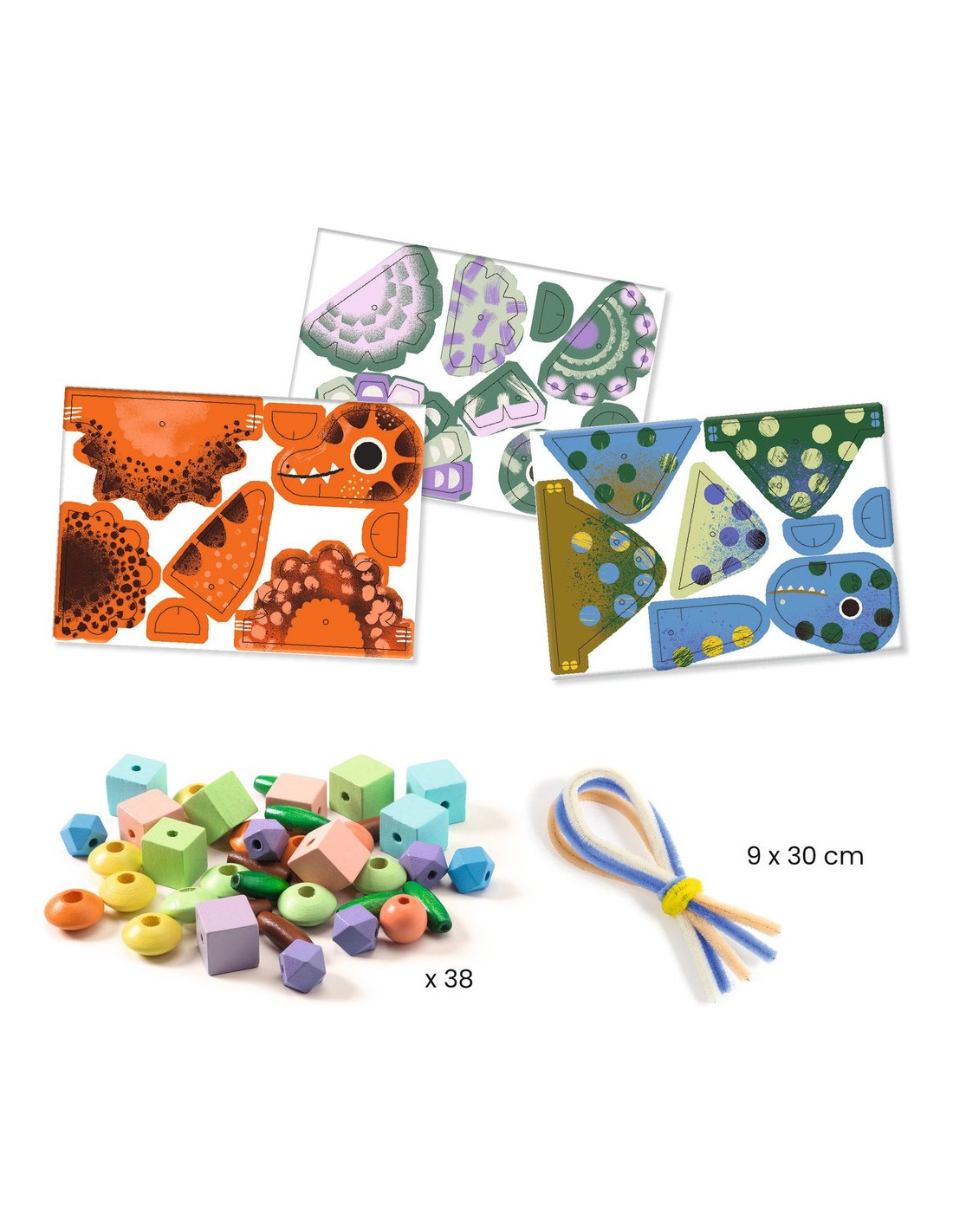 - Une multitude d’éléments à manipuler : fil chenille, perles de bois et cartons prédécoupés.