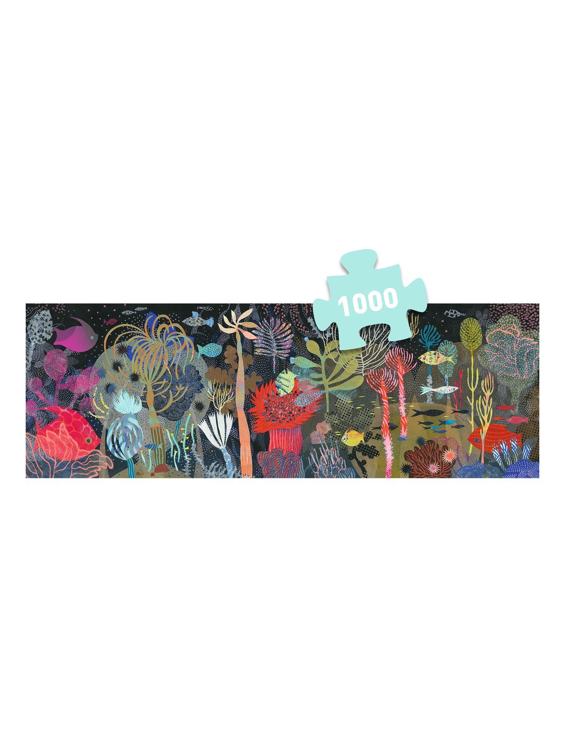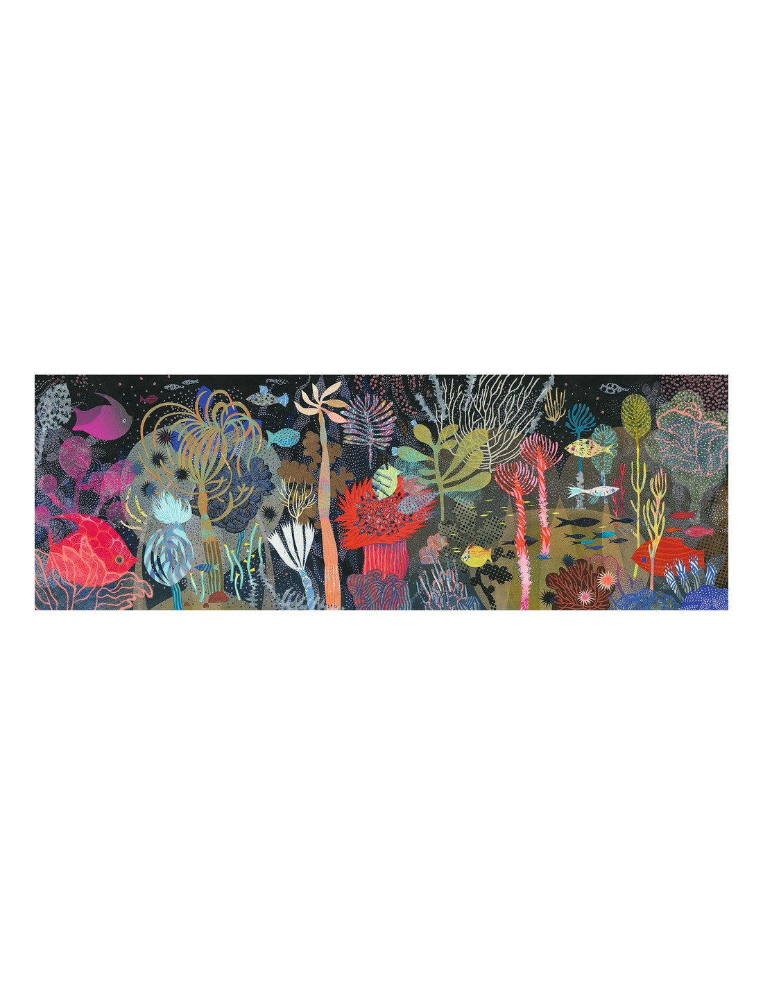 Fish Paradise est un puzzle de 1000 pièces qui révèle, sur un fond noir profond, un ballet délicat d’algues fines et de poissons aux reflets chatoyants, dévoilant la beauté secrète des profondeurs marines. Avec les puzzles Gallery, les illustrateurs laissent libre cours à leur créativité dans un format inédit tout en longueur.