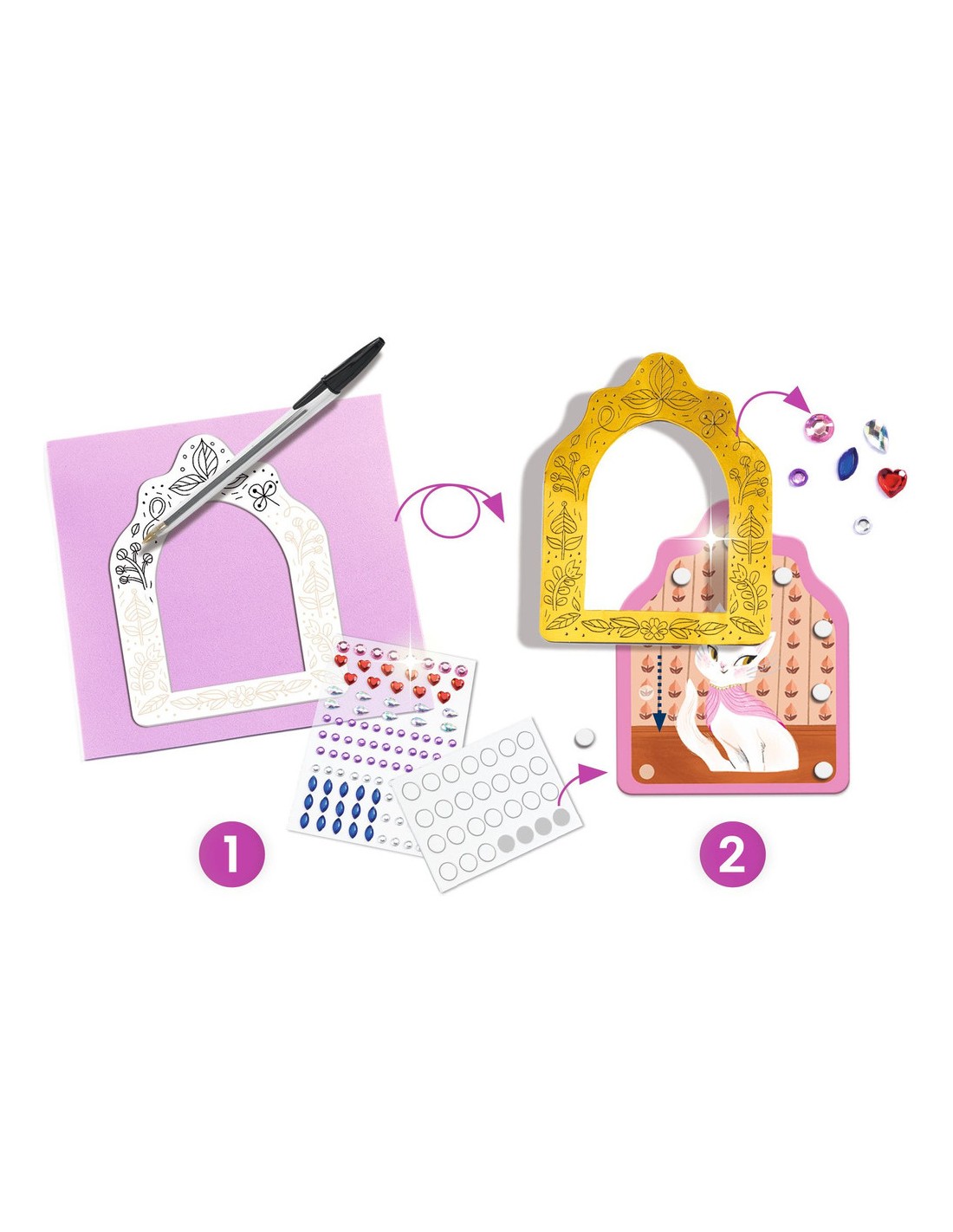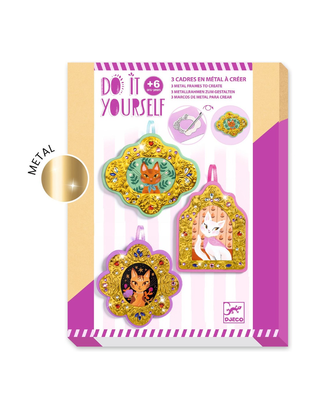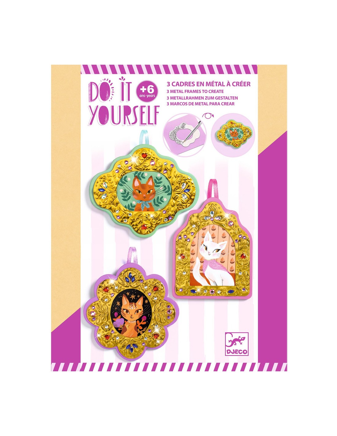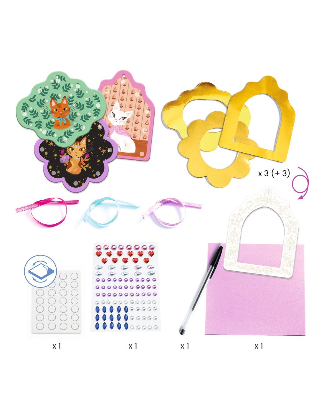 Contenu : 3 portraits de chats à décorer, 3 cadres en métal à repousser et 3 pièces en plus pour s'entraîner à l'activité, 1 plateau en mousse, 1 stylo, 1 planche avec plus de 100 stickers pierres précieuses, 3 rubans satin, 1 planche de mousses adhésives double-face, 1 feuillet d'explications pas à pas en couleurs.