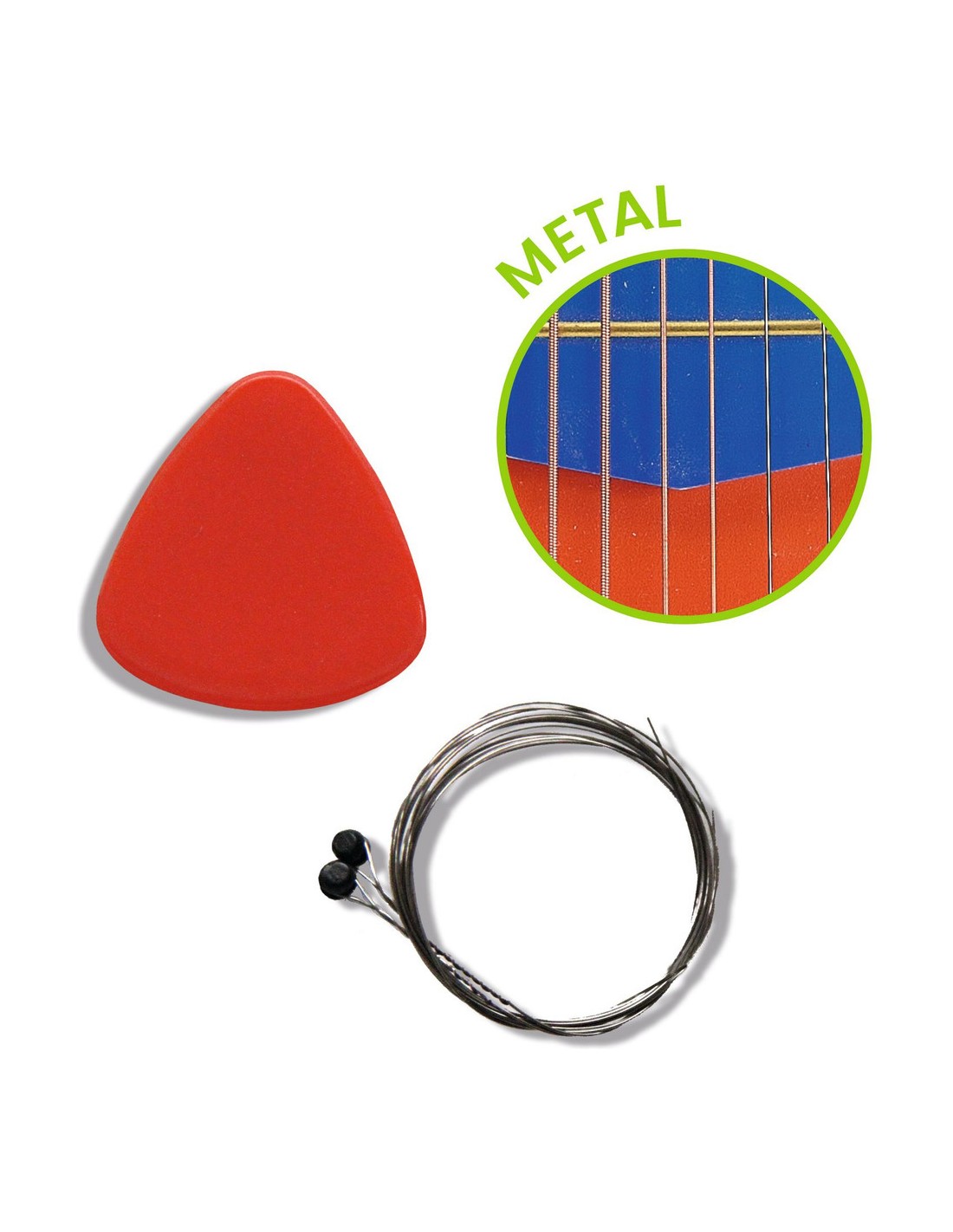 Contenu : 1 guitare (bois, métal et plastique., 1 médiator, 2 cordes de rechange.