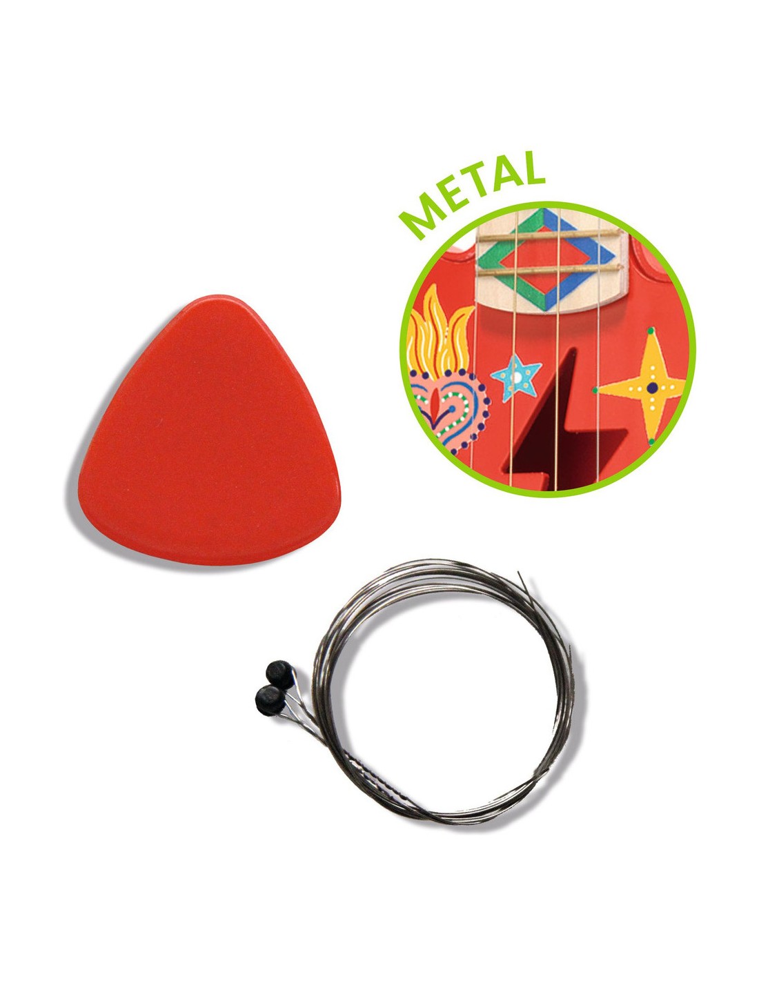 Contenu : 1 guitare (bois, métal et plastique., 1 médiator, 2 cordes de rechange.